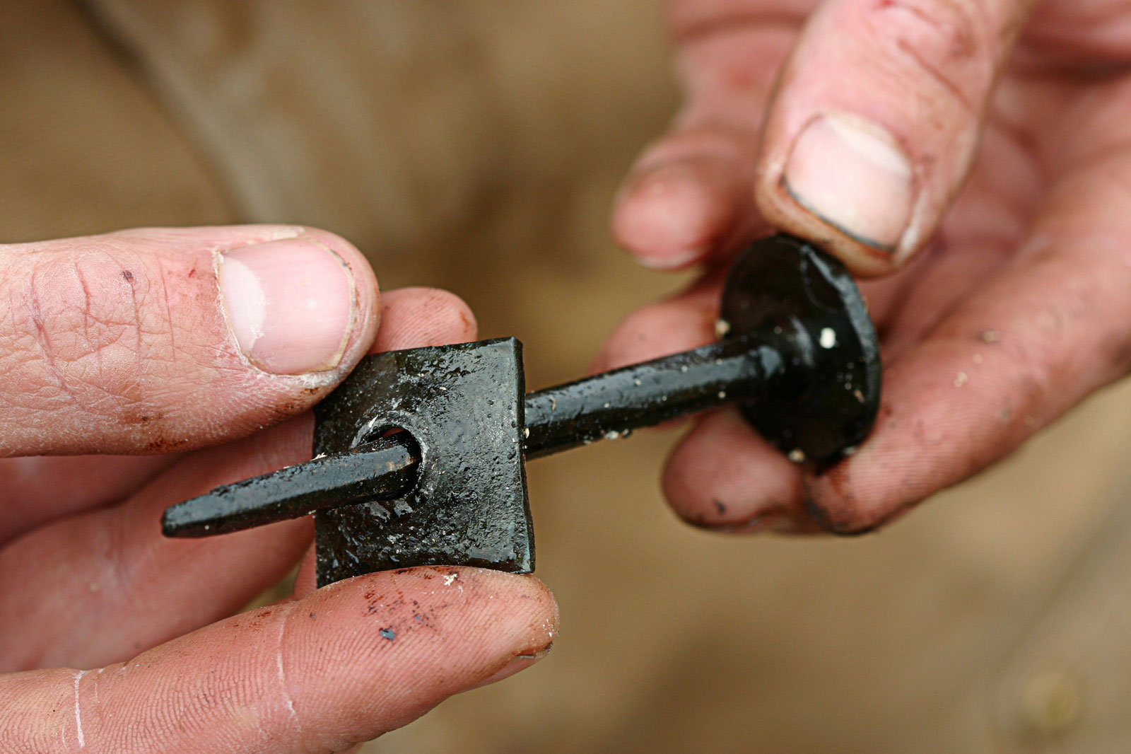 Iron smelter, Mads Jylov, and blacksmith, Jonas Bigler, ran a week-long workshop at the boatyard, where they conducted four controlled smelts using bog ore from Guldager. They produced a sample of 23 rivets and roves, which were placed at strategic points around the Gislinge Boat's hull, allowing us to explore how the iron reacts when under different levels of stress and both above and below the waterline.