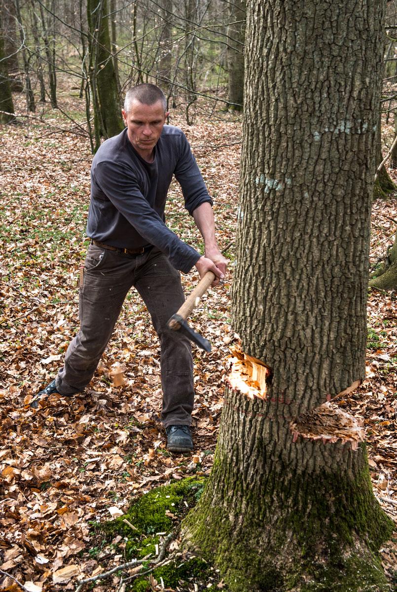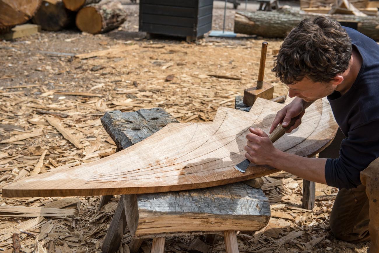 The oak for the Gislinge Boat's planks was radially cleaved, a process that splits the wood along the length of its fibres, preserving a great degree of the wood's natural strength and flexibility (Nielsen 2011:66). All of the planks were cleaved from a single oak log, a process that began in the middle of June and continued until the middle of September. The technique of cleaving is a relatively simple one on paper, but it demands a high degree of understanding in terms of oak as a material and the way in which it behaves when worked. A line of wedges was driven into the root end of the 180 year-old oak log, and these were hammered into the oak, creating the first split into halves. As the wedges were worked further into the oak, larger wedges were then utilised. As the split progressed, wedges were also worked in from the long side of the log, forcing the fibres to divide. This process was then repeated, cleaving the oak further into quarters, eights and sixteenths.