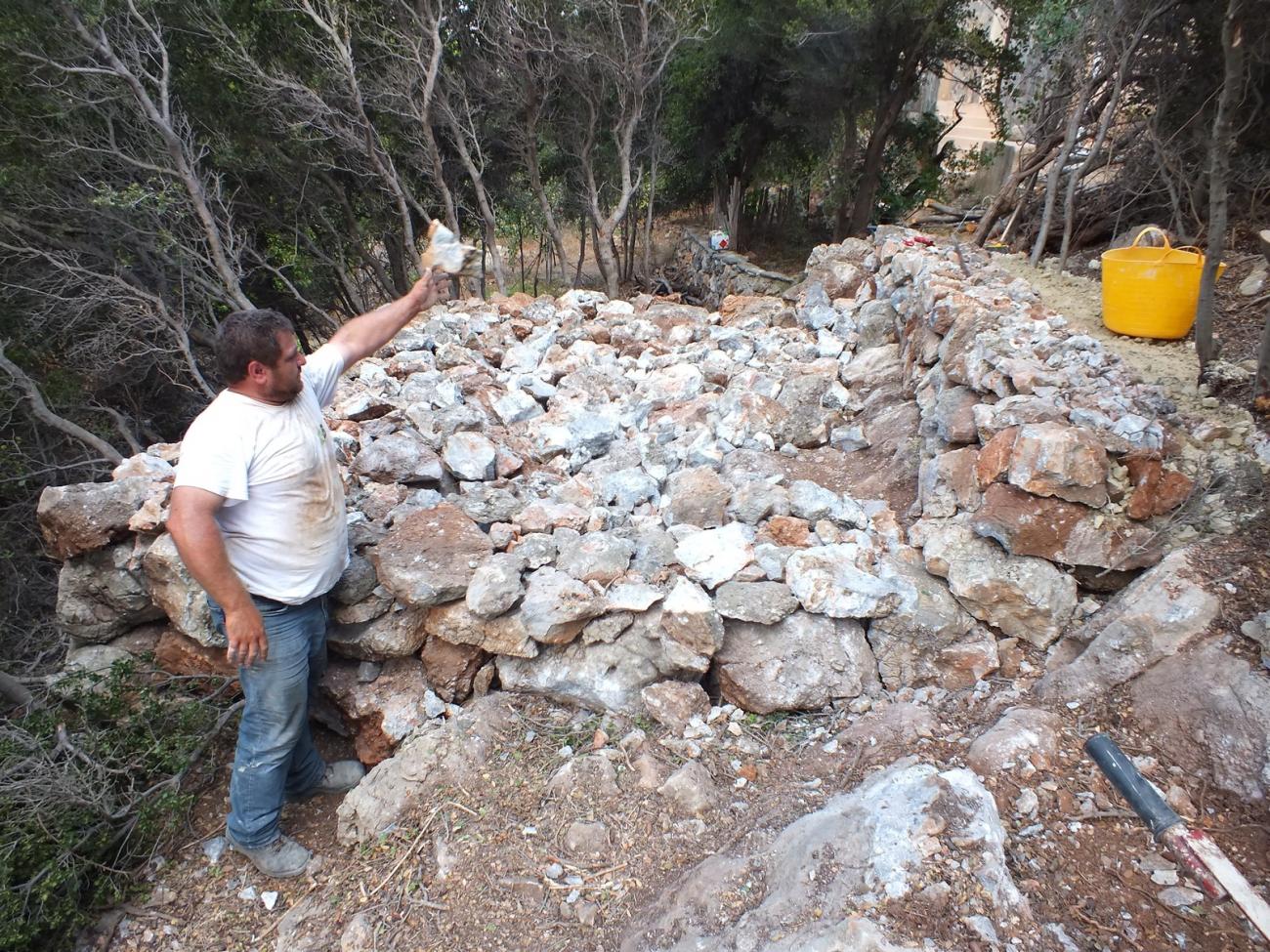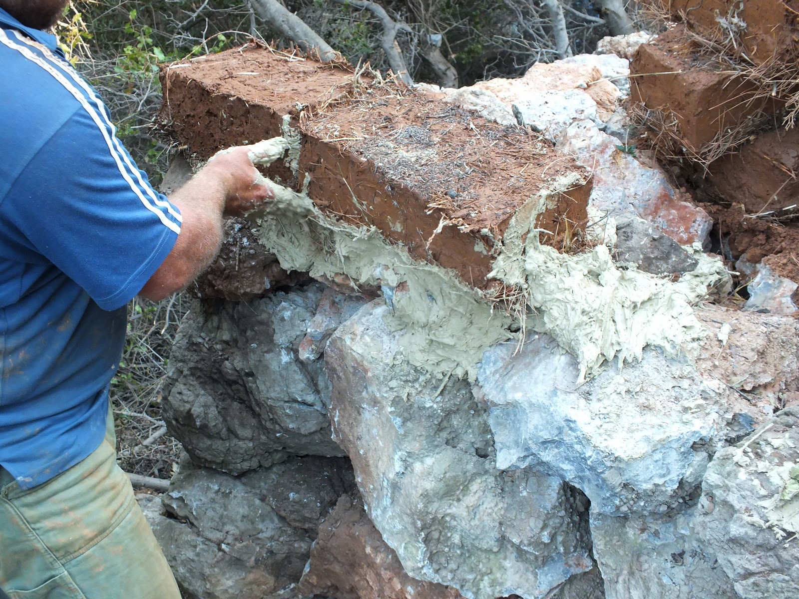 The use of stones to fill gaps was a feature we adopted from the Middle Bronze Age example in Malia, as it turned out to be much easier than trying to use more mortar, which was often impractical, especially when the comparatively fluid mortar would just run out of larger gaps.
