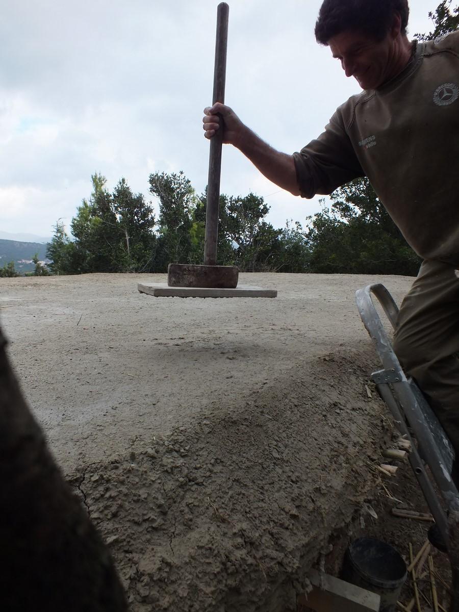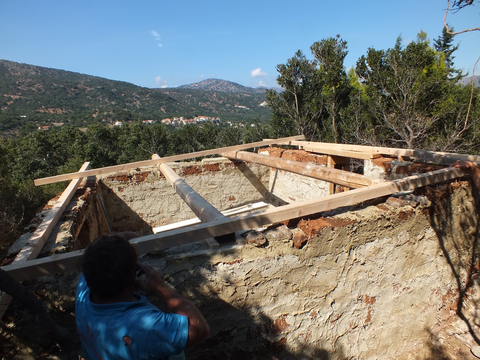 Our two large main beams were stabilized with stones on both sides, while the ring-beam was intended to ascertain the horizontal stability of the roof, always bearing in mind that Crete has frequent earthquakes.