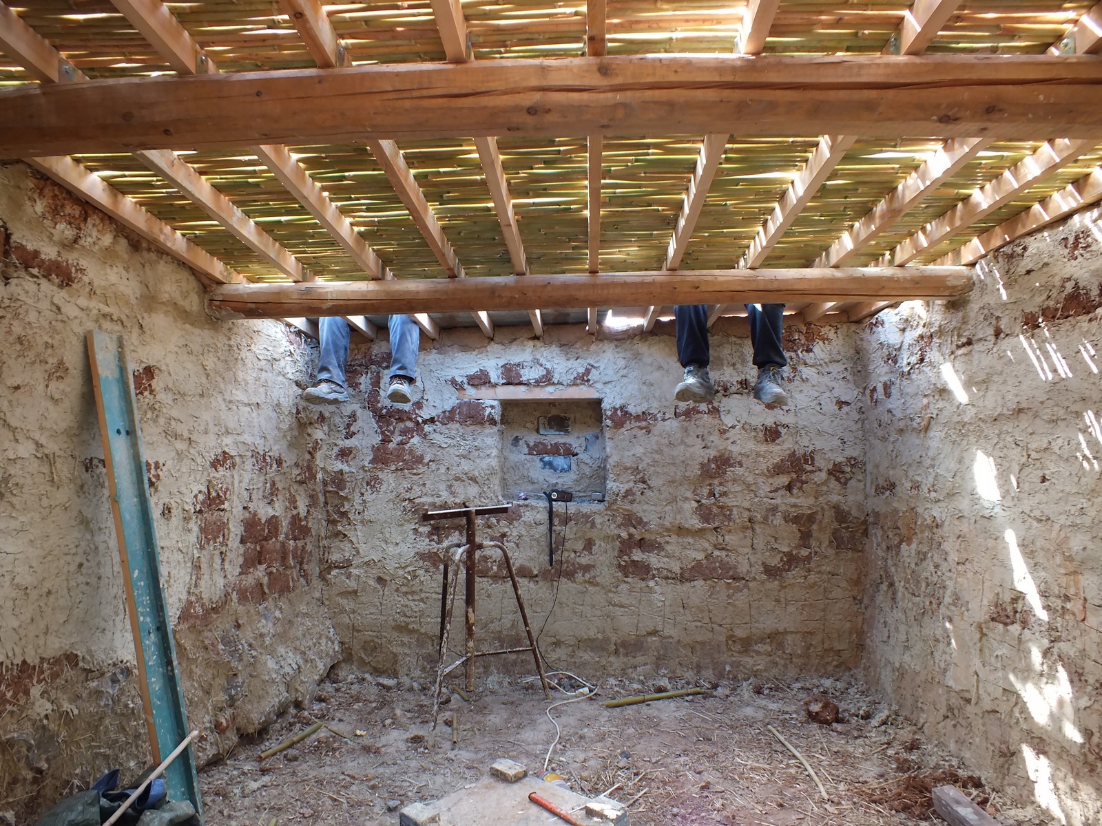 Further research into local roofing customs still have not led to a conclusive solution. When the next rainy season commenced, the roof leaked again and we changed tactics. We took down some 5 cm of the uppermost clay, the layer we had already changed several times, applied a thin polythene film and covered that again with clay. At the same time we set up 4 frames of ca. 1.2x1.2m with various roof layering variations to see if it was possible on this smaller scale to find out which roof solution would be the best. This test is ongoing as the 2015-2016 winter had very little rain, and we shall continue it until a possible next experimental house is built (see below).