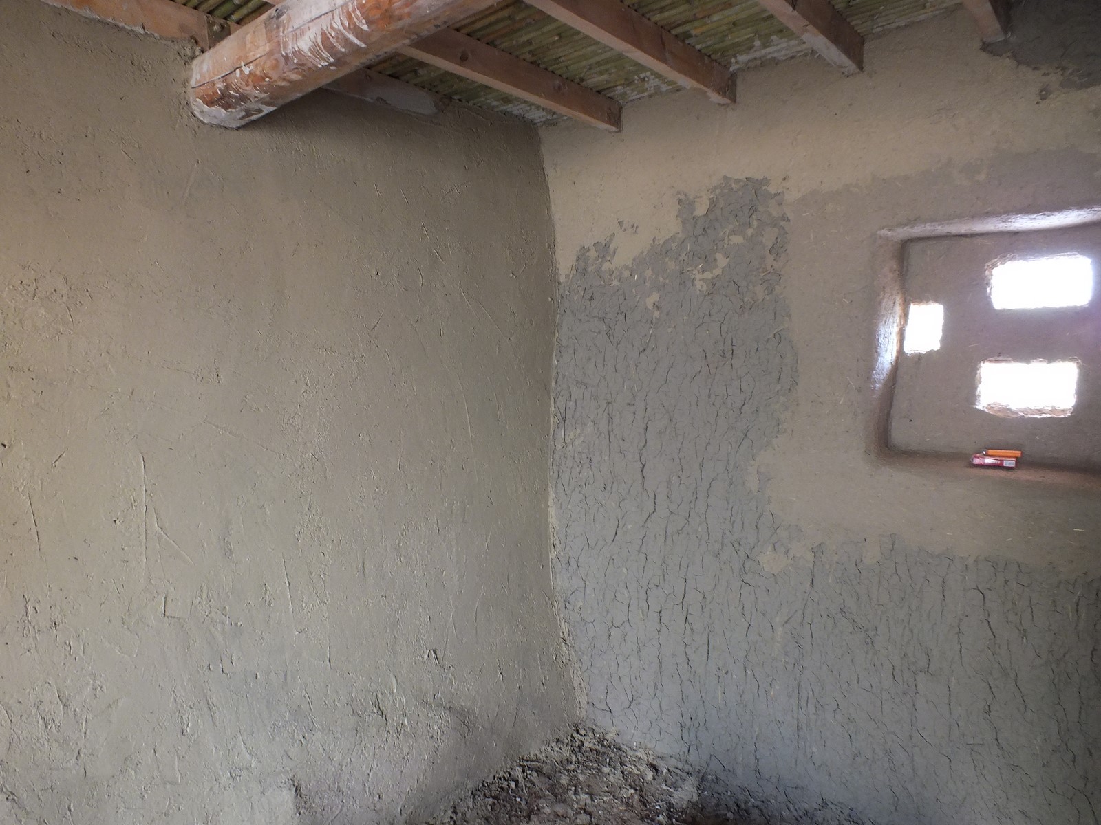 When the roof was nearly finished, with the last layers applied parallel to working on the plaster, the roughcast was applied. It was based on a similar mixture as the bricks, although instead of straw we used chaff to prevent the surface from becoming too rough. When that had dried, the final rendering was applied, again containing chaff, but in the finest grade available, with some added lime to give it a harder surface. The cracks in the roughcast were welcome in this case as they provided a better hold for the final rendering (See Figure 24). Both the interior and exterior of the house were treated in the same way.