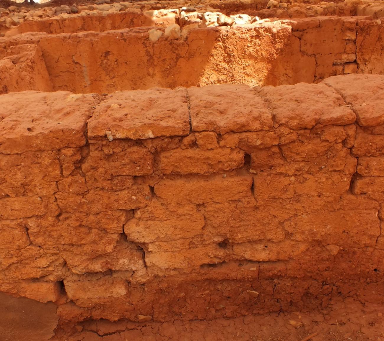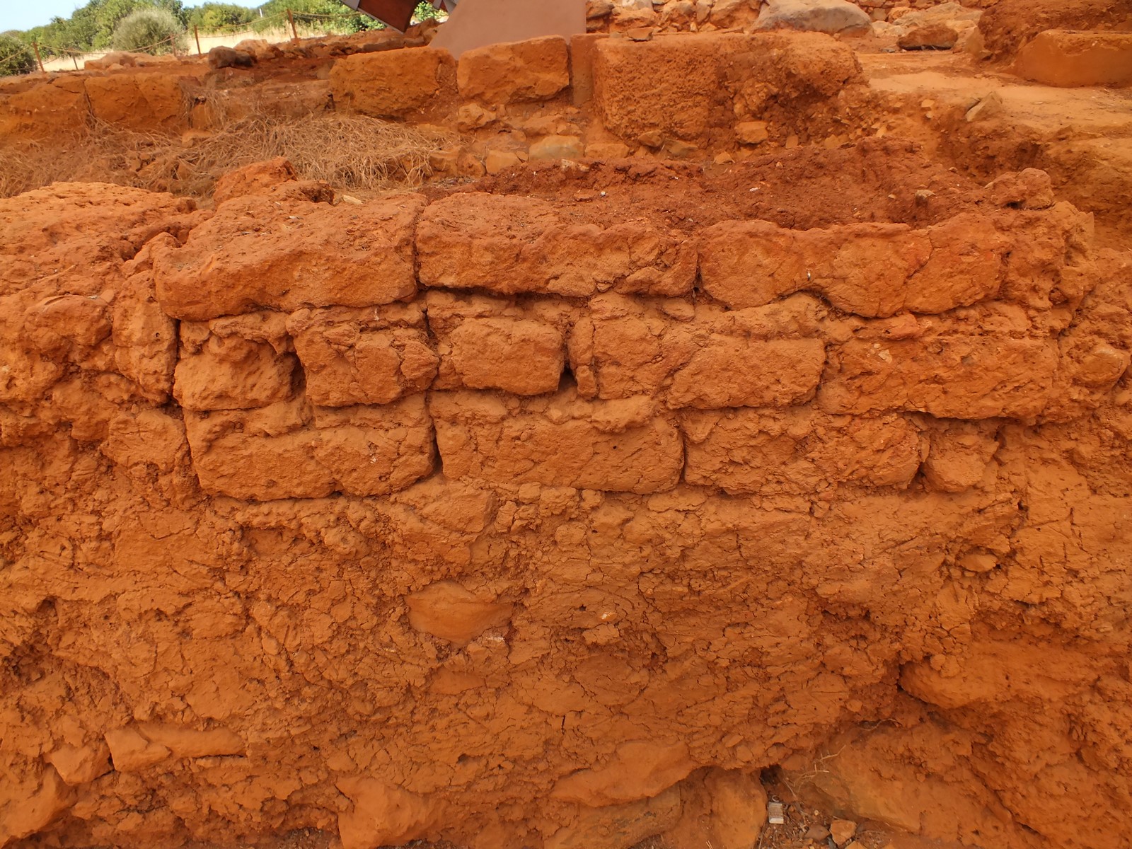 After a few days, we had reached a rhythm of building, where one batch of bricks (ca. 90-100 pieces produced by the two workers in one work session) would dry out for two days and then be utilised in construction. Following this a day of pause for producing more bricks was also advisable to give the built bricks more time to dry and thus not be deformed too much by the weight of the following layers. For the mortar we used a mixture of kouskouras in the same mixing ratio as the bricks, but freshly made every day and thus more fluid for instant building. The straw for the mortar was chosen from shorter pieces than the brick mixture to improve its workability. As an easy Bronze Age parallel the use of mud mortar in Malia Quartier Mu is well visible e.g. in Figures 6 and 7.