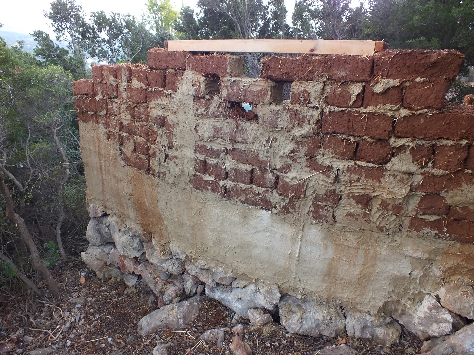 While our brick thickness of 12 cm was greater than the example known from the mountains (ca. 50% more than the ca. 8 cm there), it was a more economical solution in terms of manpower. With the same number of movements in laying bricks, 50 % more wall height is reached - and for us, manpower was by far the most expensive element in the experiment. A similar effect may have been achieved by making the bricks as large as they were in Malia, although bricks of this size would have to have been much drier before building, so as not to fold when lifted.