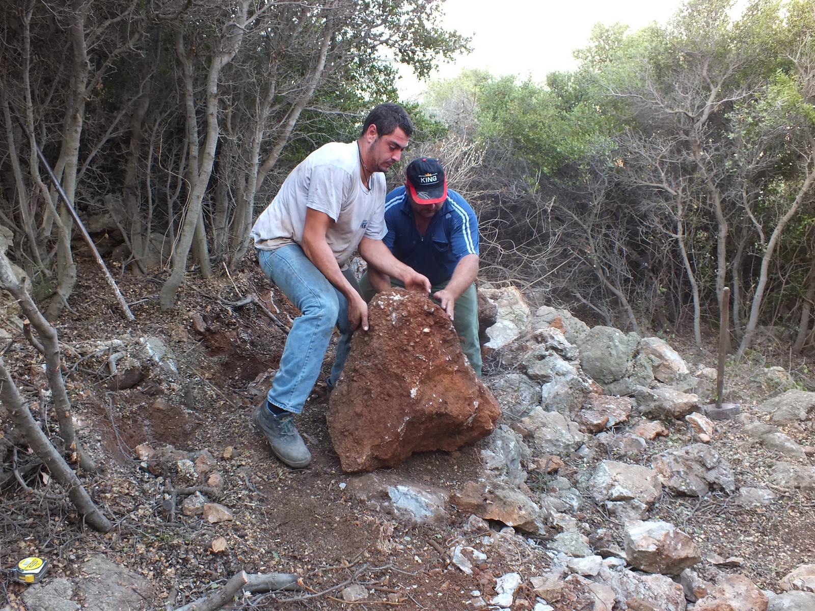 We used two kinds of tools for our foundation, a big sledge hammer to clear the bedrock parts which had to be broken off, and then a lever for moving the blocks to their final position. For a few days we employed only one worker, but discovered that two workers were the minimum requirement, as together they could move many of the big blocks (See Figure 9). One working individual most certainly required a lever, a tool which would have been difficult to produce, even if using fire-hardened hardwood, before the use of iron. The weight of the stones we moved would have broken most wooden levers, while with two (or more) workers the need for a lever was much smaller. The question of what might have been used in the place of a sledge-hammer in Bronze Age Crete remains open for debate, as all hammer-like tools that I know of would be too small for this task. Naturally uncontrolled cracking of bedrock by fire (usually only used to get rid of bedrock) or controlled cracking by wooden wedges swelled with water, as known from ethnography, would have been a possibility, too. Bedrock, frequently integrated into Minoan mountain foundations, gives the buildings greater stability, especially in the case of earthquakes.