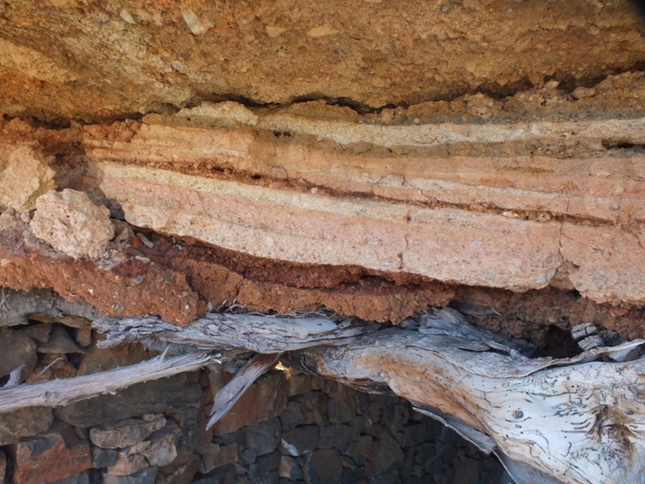 The actual layering on traditional Cretan roofs varies greatly with the local availability of material. The basics are thus: load bearing timber beams are covered with several increasingly finer layers of plant material (e.g. branches, twigs, leaves; or branches, brushwood, sea grass) covered with a layer of soil and/or finally a layer of domatochoma ("roof soil"). Each region has its own source, which the elderly locals still always know; it is usually the most waterproofing clay rich soil available in the area. In some cases this layer was only thinly applied (See Figure 21), a task that often had to be repeated every winter, which resulted in many layers. Interestingly some of the known fragments of Minoan roofing show exactly this kind of layering (Lenuzza 2013).