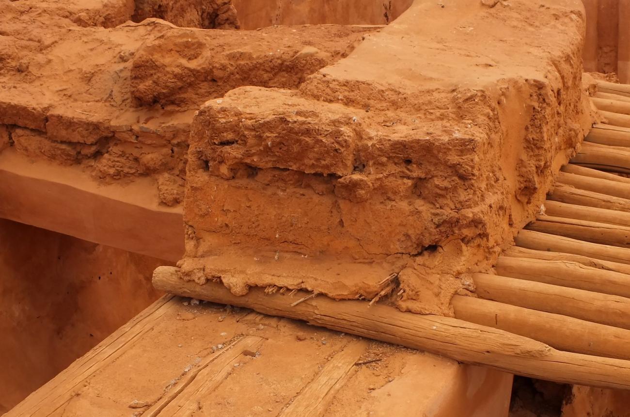 We decided to follow the general lines of traditional Cretan houses, with a slight incline, which would allow rainwater to run off easily. This is also supported by the existence of roof drain spouts in Bronze Age Crete (Lenuzza 2013:84). These could not have functioned without a slight incline to the roof, while relative flatness would still allow a use of the roof-space for various activities. We chose timbers similar in size to those which we could have produced in the sites' surroundings. This also corresponded to the type of timber known from the voids visible in the Malia Quartier Mu houses (See Figure 5).