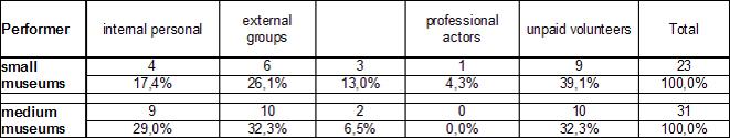 The most significant difference in responses to the question regarding who performs Living History was seen in terms of the number of museum staff. Significantly more large than small museums reported that Living History is carried out by the museum with its own staff. For both small and large museums, volunteers most commonly performLiving History. Large museums often use external groups. Both types of museums hire non-professionals for Living History.
