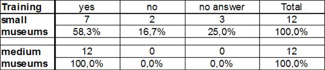 All large museums, where internal staff perform Living History, also provided training. In contrast, only 60% of small museums answered "yes" to this question. A quarter of small museums responded no to this question.