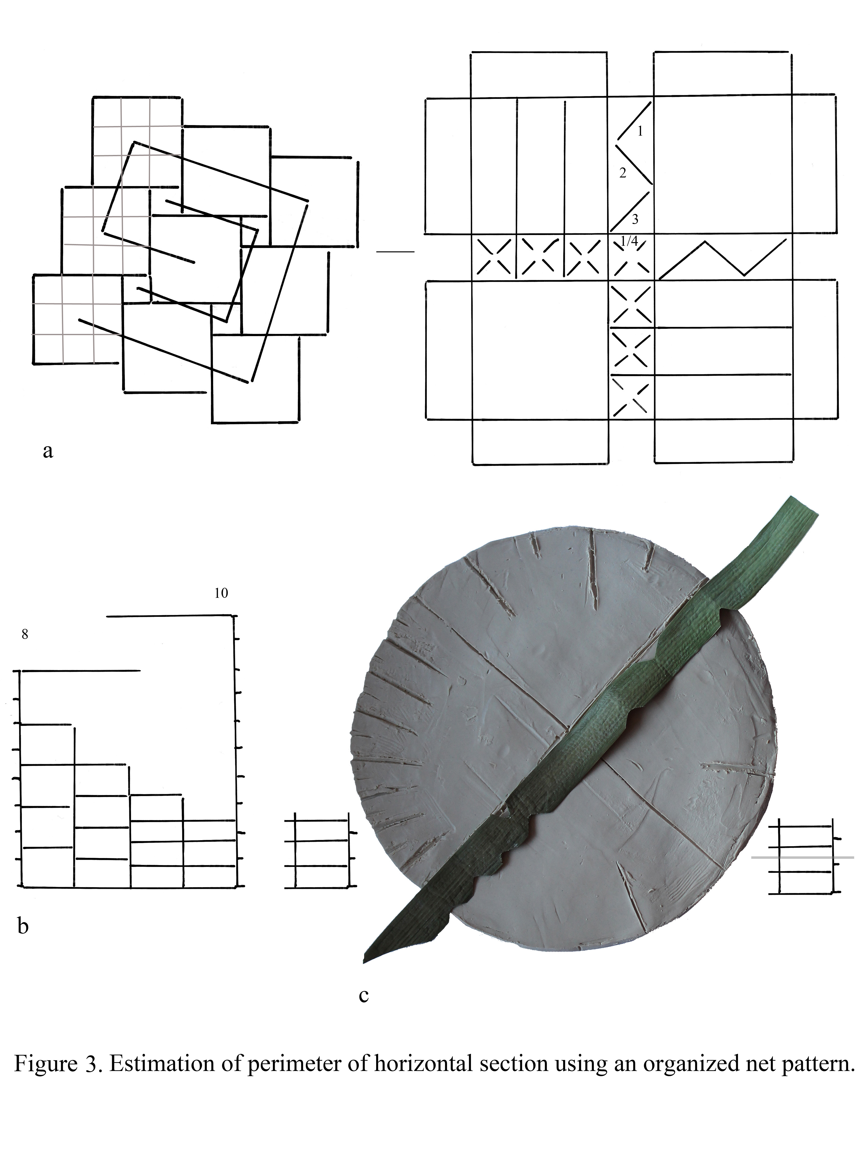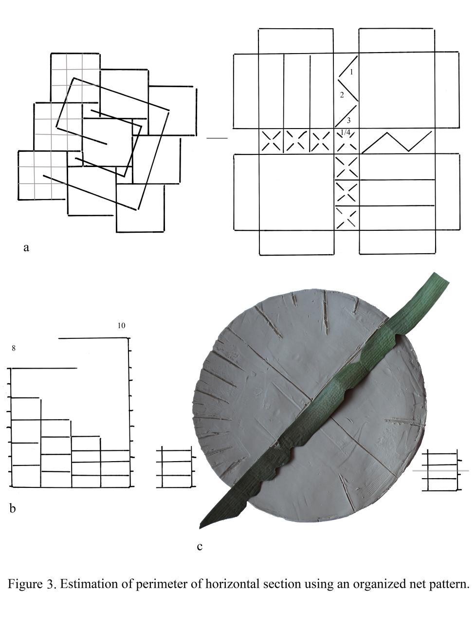 With regards to the ceramic ornamentation, there are questions as to the type of measuring tools used and the counting system employed. There are a limited number of variables applied in the crafting of a particular ceramic vessel: for example, the height of the walls, the diameter, and the perimeter of a horizontal section (See Figure 1). It is possible to hypothesize that this ancient decorative technique can be reconstructed based on application of the formalized image of the spiral in one and a half turns as a basic tool (see also Lamina 2008).