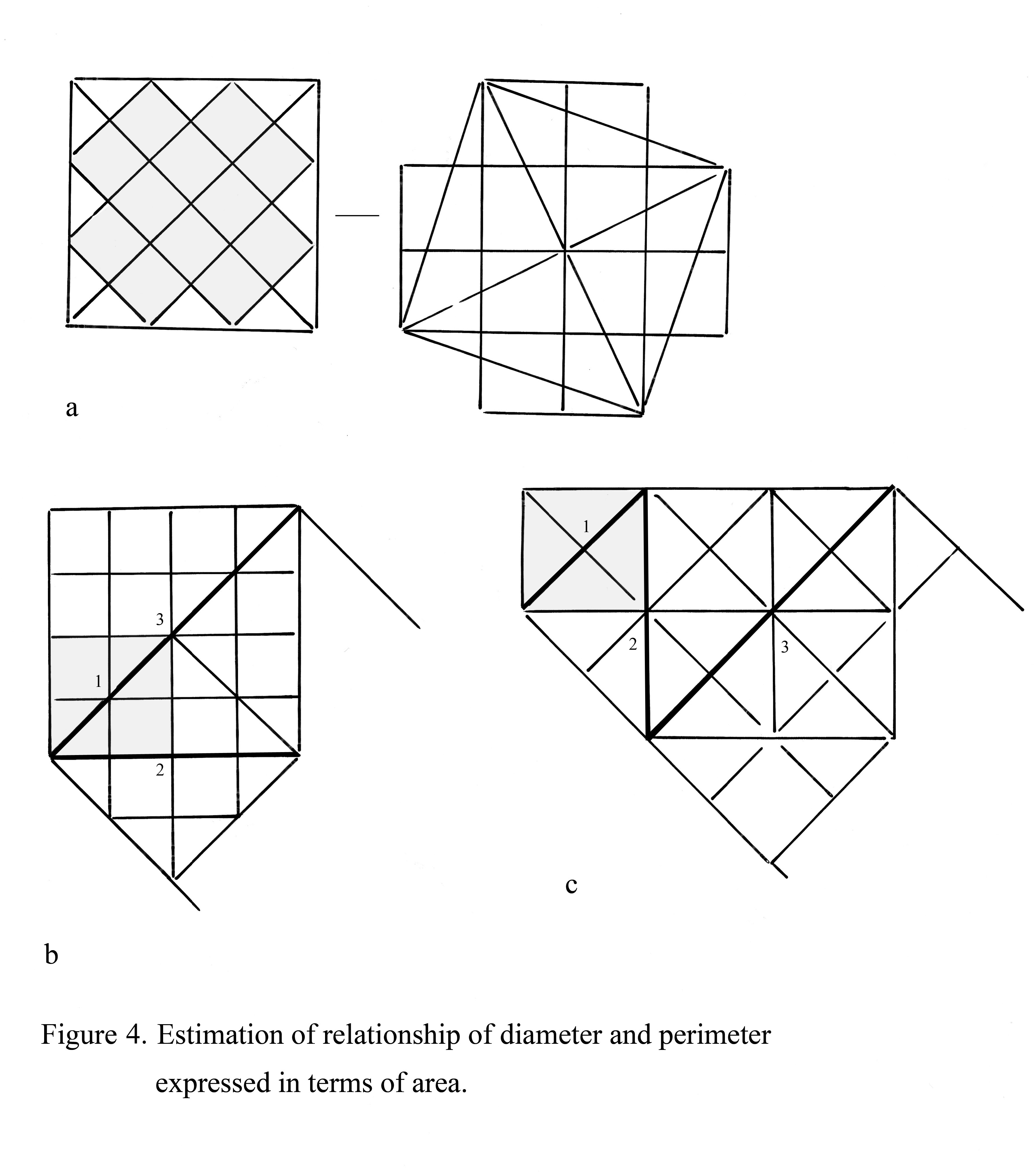 In the case when the diagonal of each conditional subsequent square (three-fold pattern) is at the same time the side of the previous one, it is possible to consider the ratio of diameter to perimeter in the terms of area. Two graphical variants may be suggested for this association (See Figure 4b, c). In both cases the pattern splits into two branches (the diagonal and the adjacent side), but the difference is in the direction of movement of the pattern. In the first case the circular direction dominates (See Figure 4b), and in the second the pattern moves forward, thus forming a smaller common area with the previous and the next conditional element (See Figure 4c). The areas of the squares form a certain geometric sequence with a step of two, regardless of changes in the magnitude of the diagonal side. Though the proportional relationship may not be obvious, however the relationship can be determined graphically using shading. The hatched area may represent a possible method for conducting such calculations.