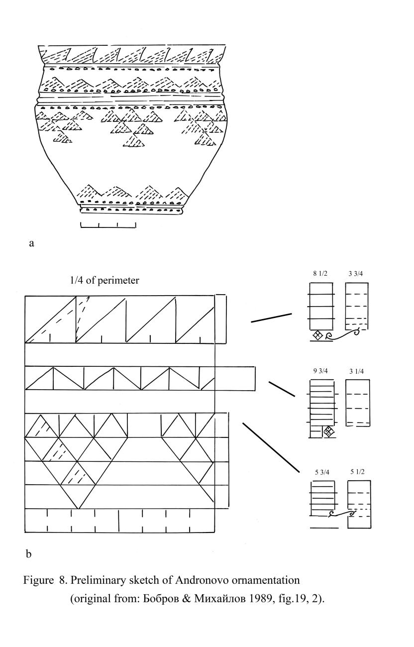According to Ivanov, “… the most simple ornaments require compliance with certain conditions …in creating an ornament, the person …should be guided by a feeling of measure, order, and calculation” (Иванов1963, 7). This remark naturally raises more general questions, which lie beyond limits of the Andronovo geometric style ceramics.