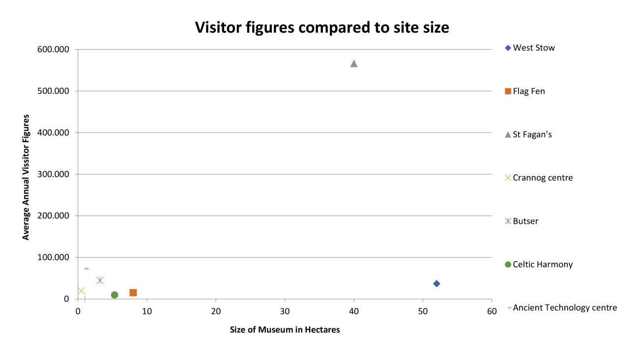 A clear relationship does not appear to exist between the numbers of visitors and size of the museum as shown in Graph 1. The smaller museums with a higher visitor figure, such as the Ancient Technology Centre, appear to be accommodating the most visitors per hectare, whilst West Stow is accommodating the least. However, it must be borne in mind that West Stow is the archaeological site of an Anglo-Saxon village and requires the larger space to preserve it. Flag Fen also has this consideration.