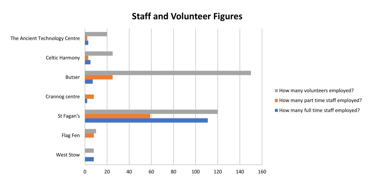 The results in Graph 2 indicate that Celtic Harmony, Butser, and The Ancient Technology Centre follow the model, with a few core staff and many volunteers - these are also the museums reporting increases in profits and visitor figures. St. Fagans and West Stow follow a similar model. This, therefore, suggests that running the site on a large volunteer workforce is not off-putting to visitors and helps to drive costs down. Indeed, 90% of archaeological open-air museums across Europe use volunteers, and 17% are run by volunteers alone (Spencer 2015).