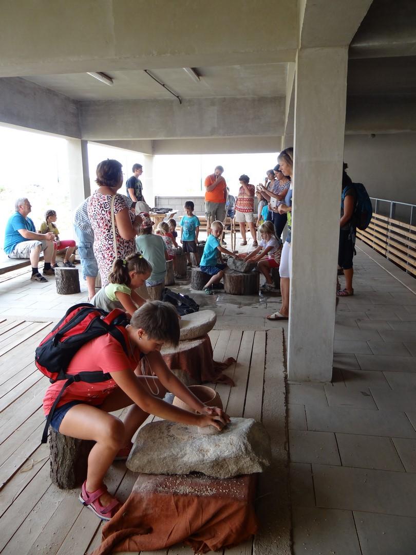 June: The theme of The First Farmers of the Neolithic includes summer solstice celebration in the roundel, drilling and polishing stone, grinding corn (See Figure 3), pottery firing, demonstration of the use of a sickle and other agriculture implements. Visitors can make an amulet from stone by drilling with a flint drill.