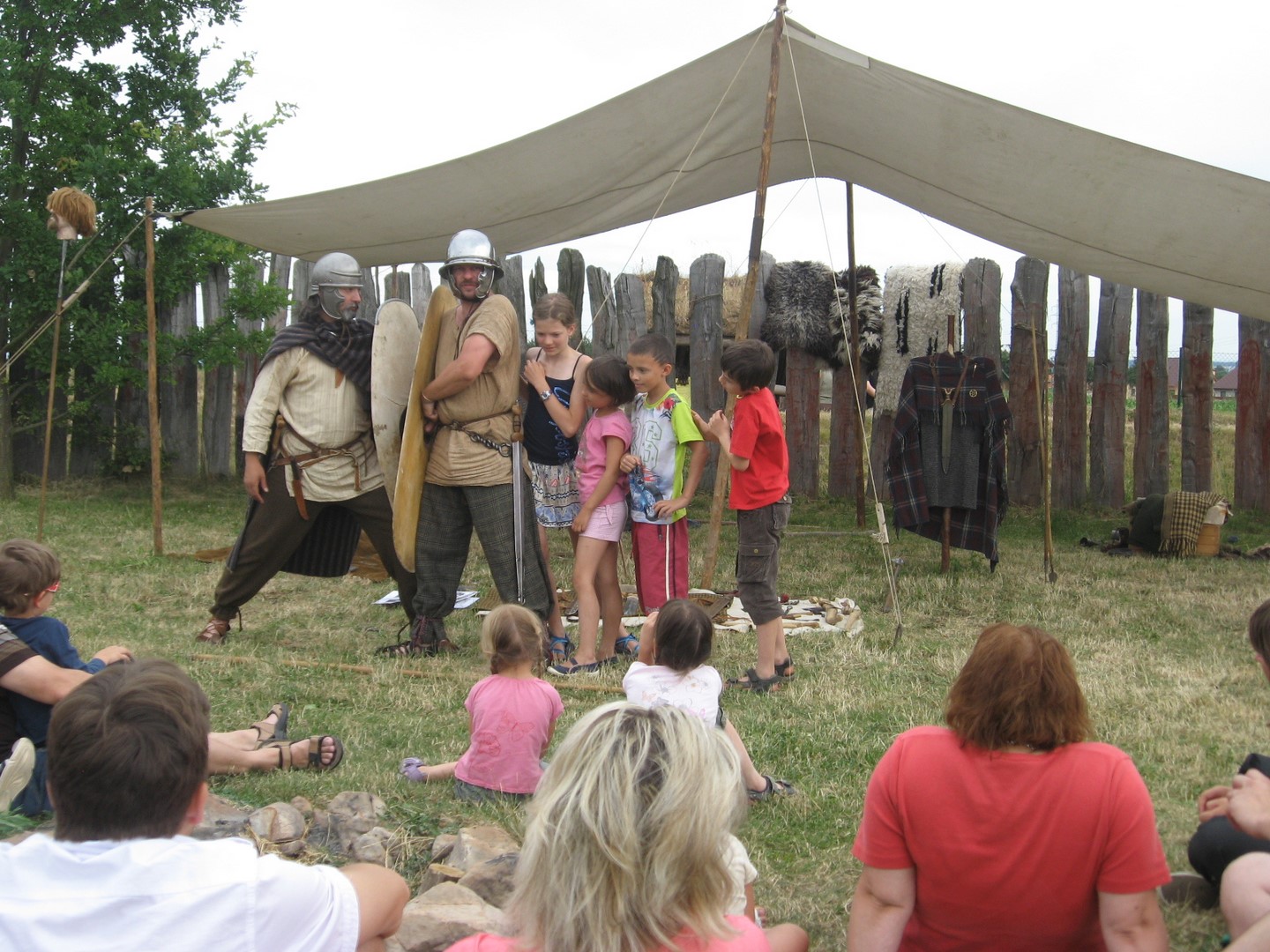 May: Romans and Germans theme presents the Age of the Roman Empire and the Migration of Peoples. The topic concerns the border regions of Rome, with demonstrations of fighting (See Figure 13). There is a possibility to shoot a bow, throw a spear, and play board games with a ‘Roman’. Children can also make a painted shield, and have their face painted as well.