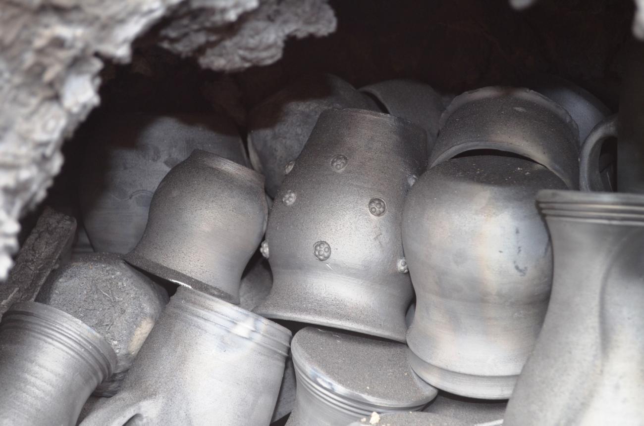 The first firing took place in the summer of 2014, when a temperature above 800°C was reached and held for over an hour. At the end, the kiln was fully sealed. The result was pottery with a partially smoked surface. The second firing took place in the summer of 2015, but had to be terminated prematurely at a temperature of around 400°C because some of the bricks made from industrially prepared fireclay, which served as a grate, cracked. The collapse of the grate dropped some of the ware into one of the fuel channels. The third firing, in the summer of 2016, was successful; we succeeded in homogenously increasing the temperature in the whole kiln, and the temperature was kept above 800°C for an hour. Overall, the temperature reached in the kiln was above 900°C; in some localised parts of the kiln, the temperature reached 1000°C (See Figure 4). The kiln was sealed again at the end of the firing, and the resulting pottery gained a smoked-metallic glossy surface (See Figure 5, 6).