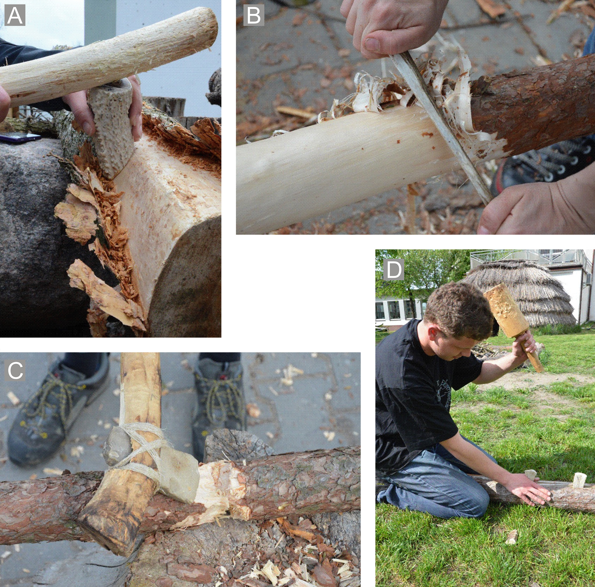 Major SEPA projects are realised during one- or two-week experimental camps. In 2001, during one of such meetings, an attempt was made to reconstruct a shallow pit-house from the Stone Age (See Figure 8) in the Sąsieczno village. In 2013, SEPA began an experimental construction of a Mesolithic hut (See Figure 9) in a mini open-air museum near the Institute of Archaeology, Nicolaus Copernicus University in Toruń. In the two experiments conducted, only replicas of prehistoric flint, stone, and bone tools were used, together with techniques available at the time (Osipowicz, Nowak and Kuriga, 2015). Recently, SEPA members built their third habitable construction – a shallow pit-house covered with turf (See Figure 10). It was inspired by features originating from Scandinavia, erected by the Samms and called goahti or gamme (Norwegian), kota (Finnish) or kåta (Swedish). Constructions of this kind may have been used since prehistoric times until the modern era. The aforementioned shallow pit-house has not yet been presented in greater detail, so we shall devote some space to it here. In the first phase of the work, a rectangular pit with straight walls was dug. Next, every several tens of centimetres, pine stakes braided with willow were driven into the ground. The walls prepared in this way were covered with a mixture of clay, sand, grass, and water. The design of the roof initially included (as in an original goahti) two arcs made of naturally bent tree trunks, however, due to the lack of such a material, a decision was made to construct a simple frame from pine beams, which was subsequently covered with wood. The next stage was to isolate the roof from the top with patches of birch bark (in case of the walls, due to the insufficient amount of this material, a layer of reed was fixed instead). Thus prepared surfaces of roof and walls were then covered with bricks of soil with turf. Inside the dwelling, the walls were whitened with a layer of chalk and decorated with paintings made with ochre, inspired by a representation of a site in Alta, dated for 6200 to 2000 BC. The construction of the shallow pit-house was a great opportunity to carry out a series of experiments with prehistoric techniques of wood working (See Figure 11), such as debarking with antler and flint-mounted planes, and wood splitting with wedges made from various osseous materials.