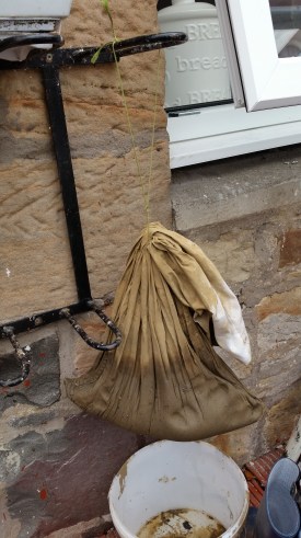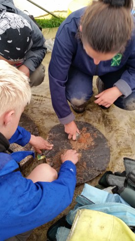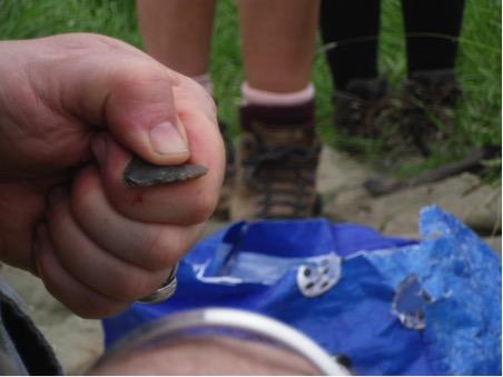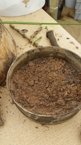 Once we knew that woodworking and flint knapping were in our schedule, we thought we should see if we could combine the two products from these activities to make a tool. In order to do this, we decided to try making glue with resources that would have been available to the prehistoric people at the Bradford Kaims. An article by Lyn Wadley (2005) focusses on residue studies from lithics found in South Africa, and suggests that ochre was part of the adhesive and not simply decoration on the surface of the tool; when we saw red ochre coming out of the ground in Trench 6, we decided to include it in our recipe in order to take advantage of as many natural resources as possible.