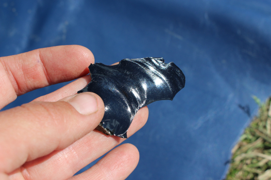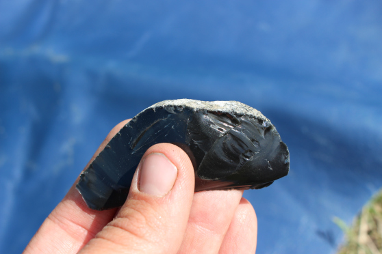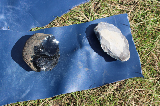 Students, staff, and local volunteers learned the basics of knapping and attempted to create usable pieces of worked stone. We had two types of stone materials to use: flint and obsidian. Due to its harder nature, we began our experiments using flint and we learned how to properly hold the stone and how to strike. After everyone got the feel for the tools and how the process worked, we began using the obsidian which was easier to flake off, but very sharp. A benefit to using obsidian is that the ripples created from striking were easier to see, facilitating a better understanding for the mechanics behind knapping. We saved the usable flakes to test out later in the season during out woodworking project and we tried using the scrapers and awls on some leather hide, with some success!