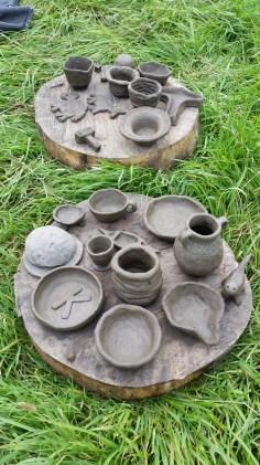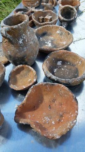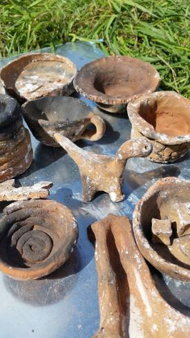 Our next experimental archaeology project was an effort to make a variety of pottery vessels using only raw clay sourced from our prehistoric site here at the Bradford Kaims Wetland Project. ”Prior to the Roman invasion, almost all native pottery in Britain was hand-made and open fired” either on the ground surface or in a pit (Gibson 1997:26). Prehistoric ceramics ”were made primarily for domestic use, as storage, cooking or serving containers, or to receive or accompany the bones or bodies of the recent dead” (Woodward 2008: 85-86). Since wheel-throwing and kiln firing produce finer ceramics, prehistoric pottery was comparatively rough and weak compared to the later Roman varieties, but it evidently served its various purposes well enough. Archaeological evidence suggests that the early production of pottery was non-specialised, and that it was being produced ”as and when needed, regardless of the time of year” (Gibson 1997:48).