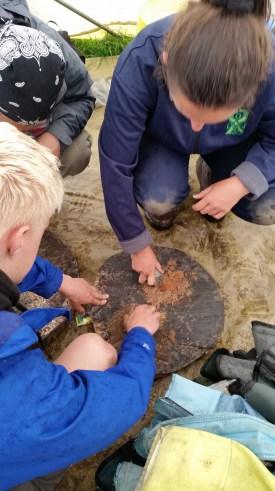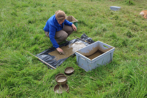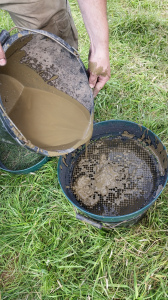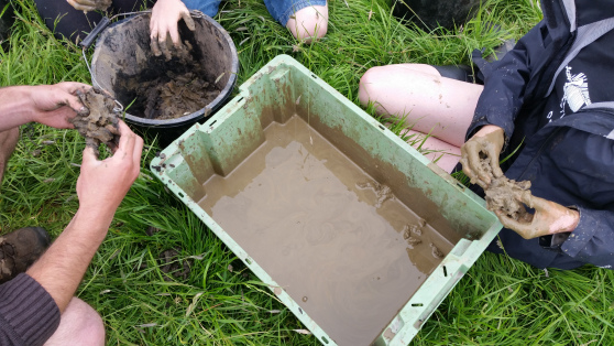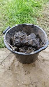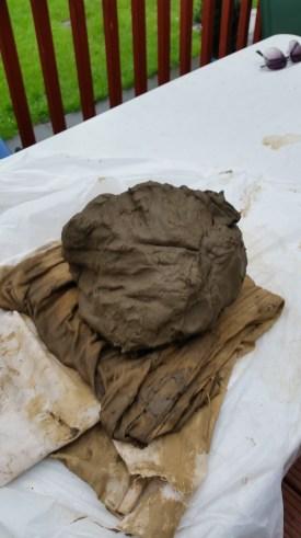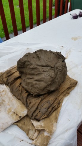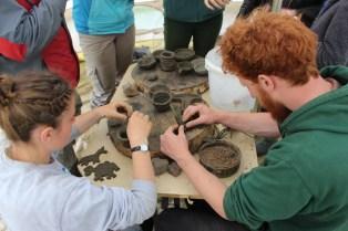 We knew from previous seasons that the trenches and test pits often turn up natural clay deposits of varying colours and quality. Excavations here at the Kaims have also produced a few examples of possible Late Bronze Age or Early Iron Age potsherds. So, given the pottery record on site and the abundance of raw material, this summer’s experimental archaeology program seemed like a perfect opportunity to test out our prehistoric potting skills! Altogether the process of preparing the clay, forming the pots, and the subsequent firing turned out to be a messy, fun and educational experiment for all involved.
