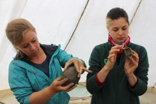 Next, we tried pressure flaking which proved to require more finesse. This involves abrading the surface (crushing/sanding down the inconsistent edges to create a stable edge for sharpening) and then applying pressure directly onto the flake edge with a softhammer, pulling down with an antler tine to flake off tiny pieces. This process, though difficult, is necessary as it strengthens and sharpens the flake edge creating a blade. This technique was more difficult to grasp, but everyone was still able to attempt it and gain an appreciation for the skills required to manufacture stone tools. At the end of the day, we saved the flakes which we thought could be hafted and students were able to take a souvenir piece home with them.
