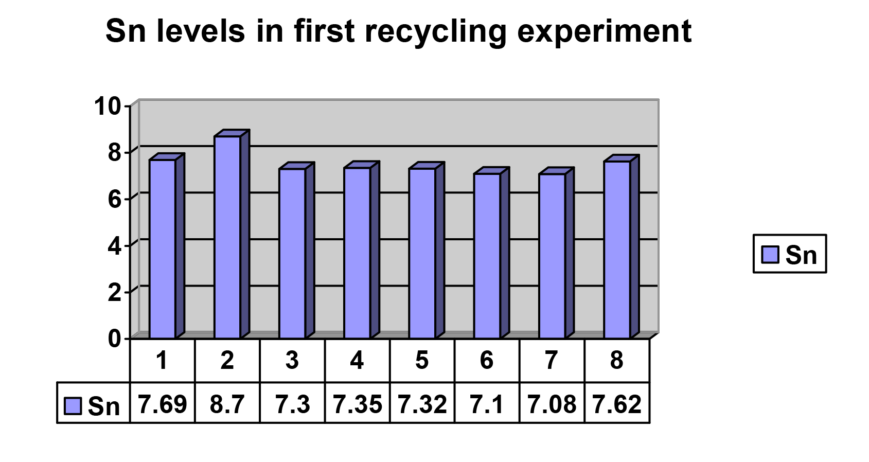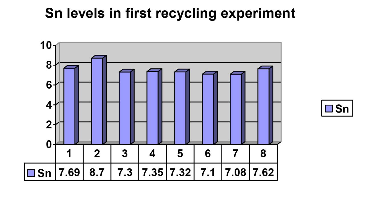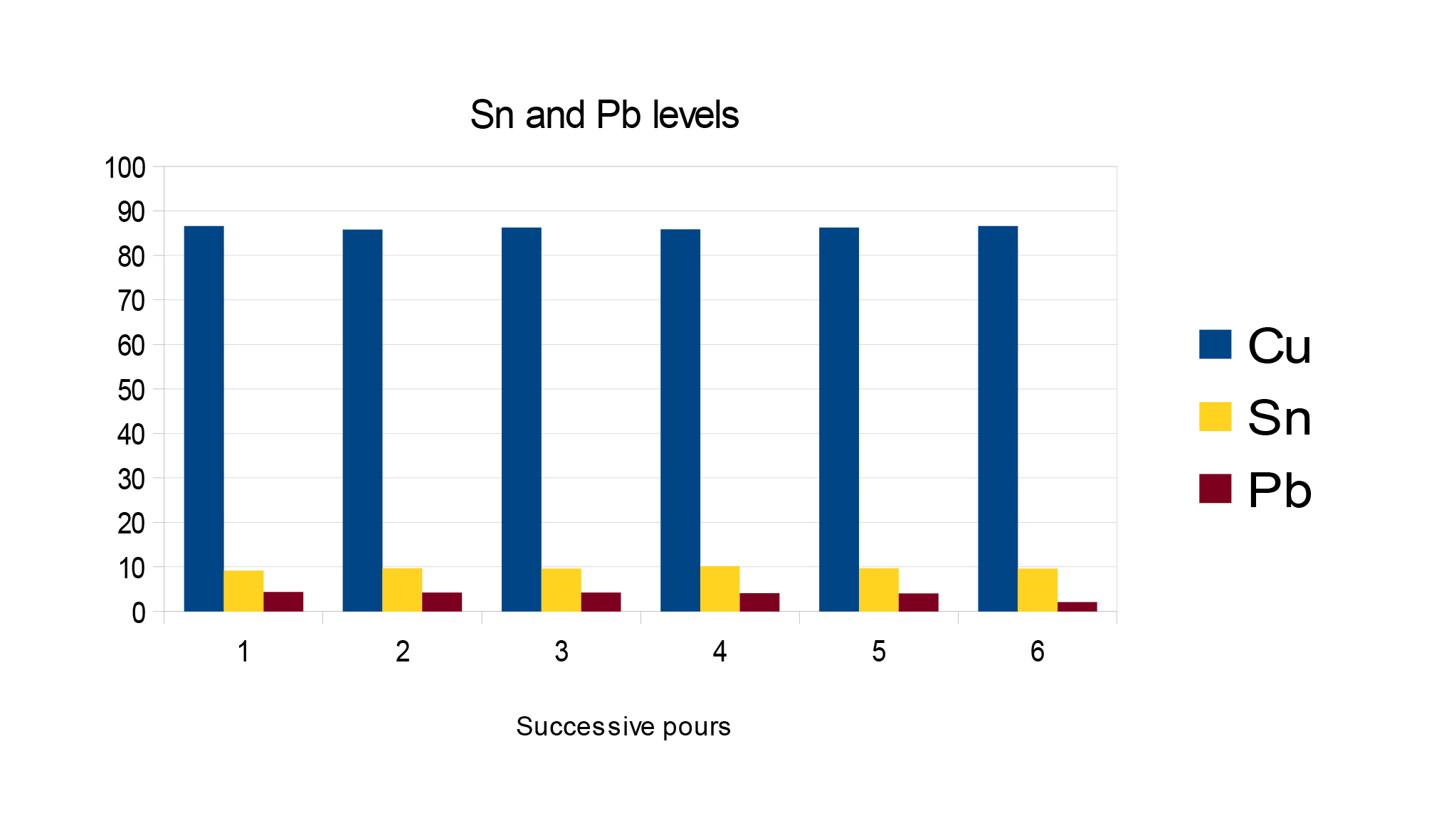 The first set of recycling experiments was replicated using a charcoal furnace and bellows, this time using a 90% copper and 10% tin alloy that was purposely mixed for the experiment. A Bruker portable XRF was used for the analyses at the Cambridge University archaeological laboratories, operated by Dr Unavane. The results were substantially the same as in the earlier experiments and no tin was lost during recycling. In addition, the small amount of lead that was part of the alloy was also stable through the recycling episodes (See Table 5).