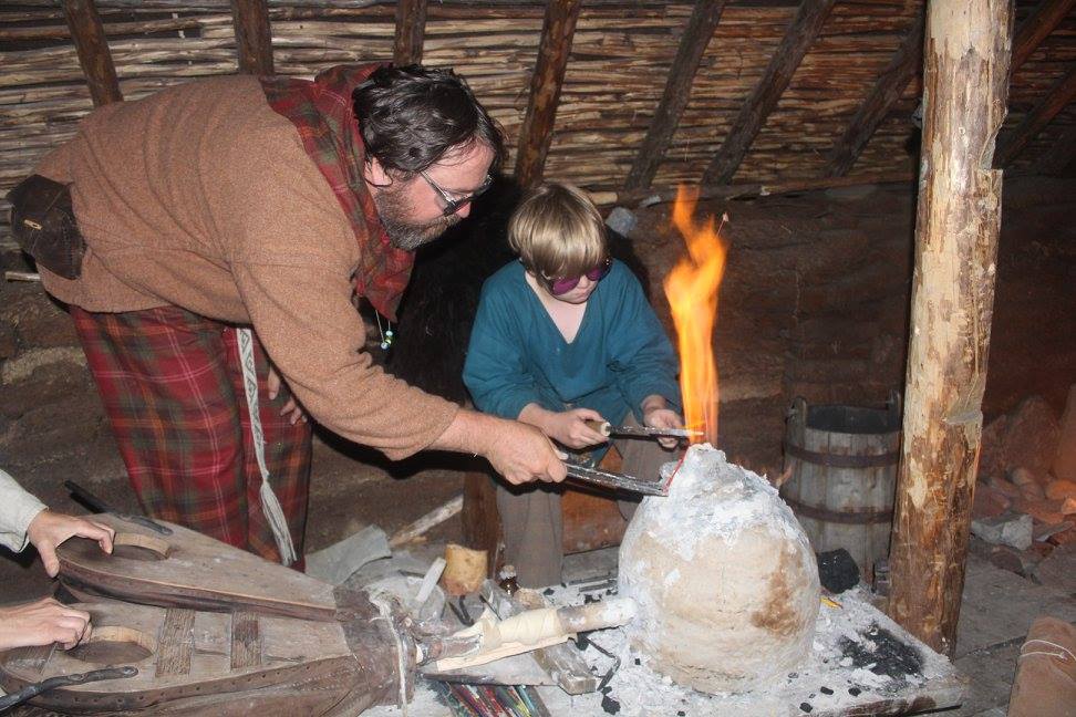 Liam and Keiran represent our youngest members. Children of the time would have split their time between a variety of activities - ours do the same. The majority of the day was spent doing chores such as fetching water, washing dishes, carrying food, breaking charcoal and learning their runes. Playtime was liberally interspersed throughout the day, including time spent helping to educate the site's visitors on the details of playing hnefatafl. The remainder of their days were spent learning from the various craftsmen to build their knowledge base and help them choose their future careers (See Figure 15).