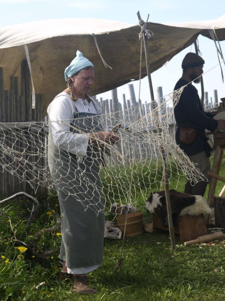 DARC brought two looms with them. Robert Schweitzer further expanded the textile activities with a tablet-weaving loom based on the Oseberg ship burial. His display included a full range of fibres and techniques of brocade, double weave, and colour pattern weaves. The second loom was a warp-weighted loom, where Jo made slow progress on setting up a fine linen warp, discovering only on the last few days she would have been better off making a new set of heddles rather than trying to thread the highly twisted single ply yarn through the existing set (See Figure 8 and 9).