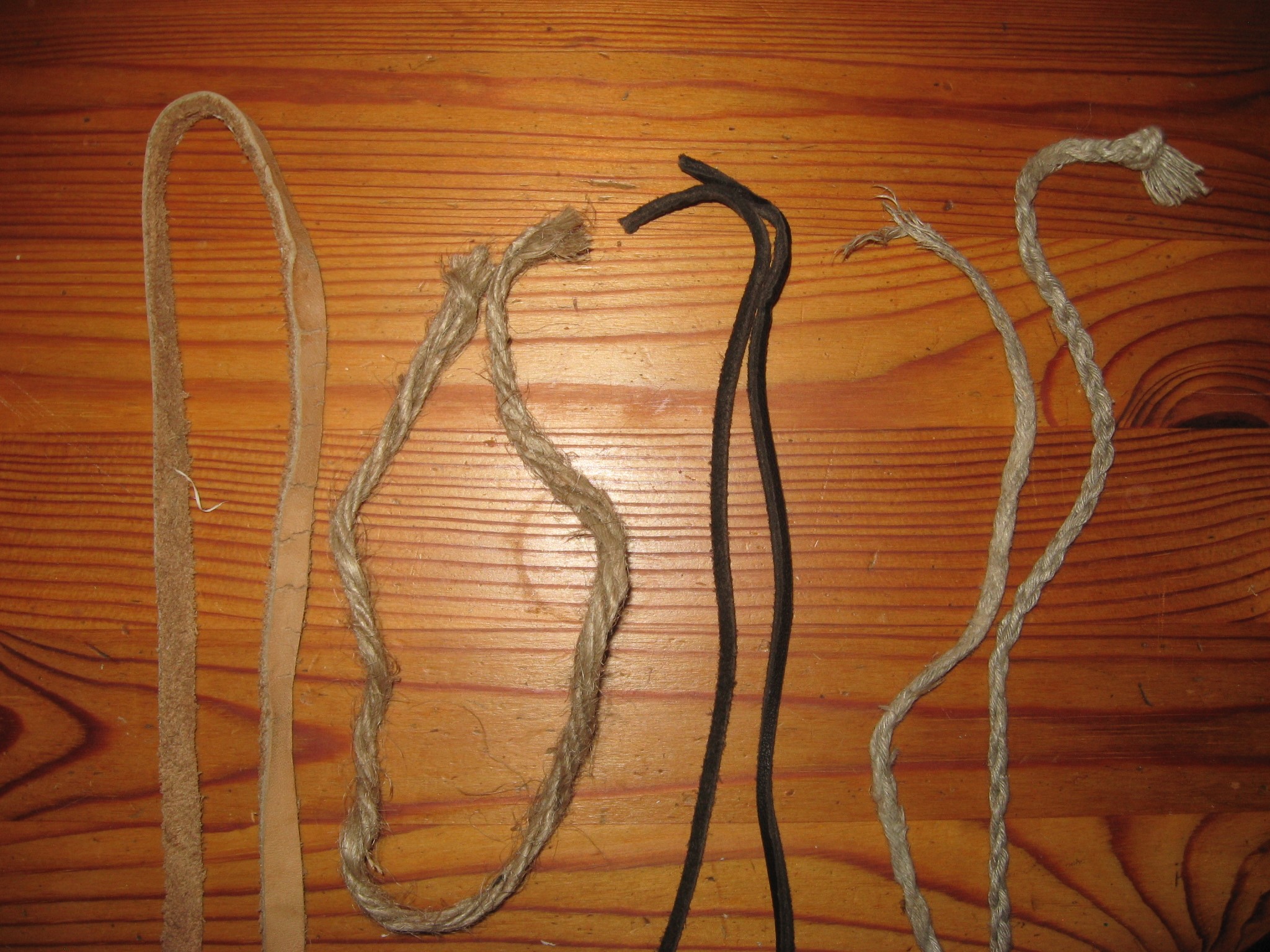 Finally, while turning on the lathe, Marcus experimented with a variety of drive cords. In order to spin the workpiece, a mandrel is driven into what will be the centre of the inside of the bowl. A cord or thong connecting the foot pedal to the spring pole is wrapped around the mandrel in such a way that, when the pedal is depressed, the mandrel (and workpiece) revolve. Until recently, Marcus had focused on the use of scrap ~0.3 - 0.5cm square leather lacing. However, not all thongs and leather are created equal, and he had been having trouble finding a supply of lacing that was sufficiently hardwearing. Because the lathe was set to be left at the site after the visit and the last of Marcus' workable lacing was nearly exhausted, several alternative materials were tested during the visit, including purchased 0.3 cm latigo leather lacing, single ply natural jute twine, and 4-strand hemp cord made on-site by Bonnie and Jo using a slung (Danish whipcording) technique. Both the latigo lacing and the jute twine failed quickly and did not represent viable materials. However, the whipcord worked excellently, a single strand generally lasting through a couple of days of continual and often hard use. Measurements before after use indicated that the cord stretched only 7% during use, although this was probably localised to the part that ran on the mandrel. Although even more durable materials are being sought (suggestions included seal or walrus hide), the capacity for the whipcord to be replaced easily using on-site materials and in-period production methods makes it a highly viable interim solution (See Figure 19).