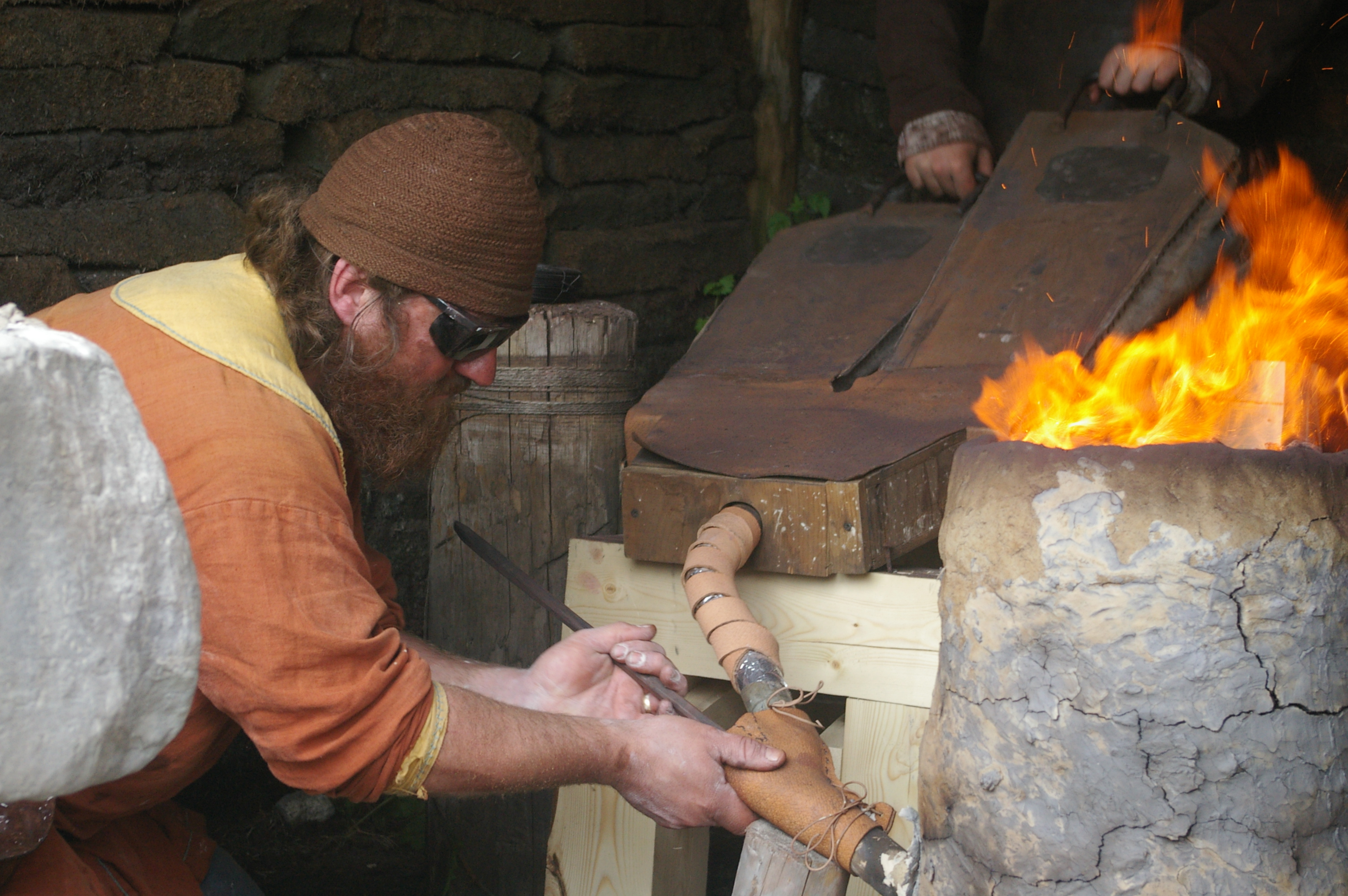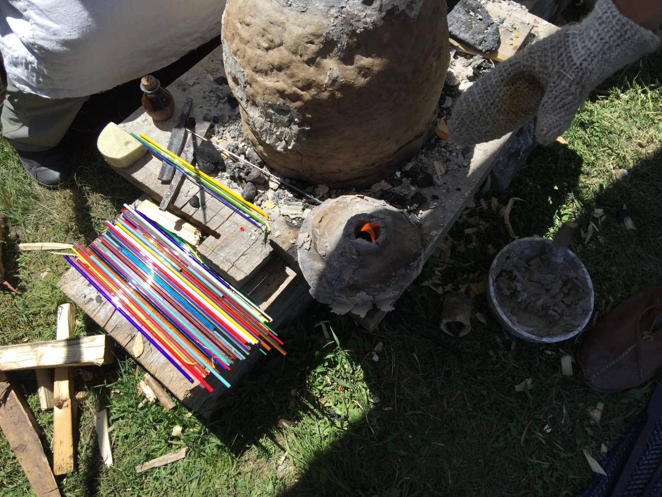 Neil Peterson expanded his normal 'trade' station by setting up a station that represents a change in the direction provided by Parks Canada. In the past, Parks Canada has focused on only presenting activities that are known to, or can reasonably be extrapolated to have occurred at, the site within the reconstructed area. In the original programming, activities that did not occur on-site were presented outside the 'historic' enclosure, or at the Visitor Centre. At their request, an active, hands-on, beadmaking reconstruction was set up outside the main turf hall. Many of the staff, and some visitors, spent time learning the frustrations of beadmaking in an environment where wind is a constant and highly variable addition to the process. Robert Schweitzer and Parks Canada staff member Jaime added additional personnel to this station as required, assisted by many other people as the need arose for another pair of hands on the bellows. On heavier weather days, the setup was moved inside (See Figure 10 and 11).