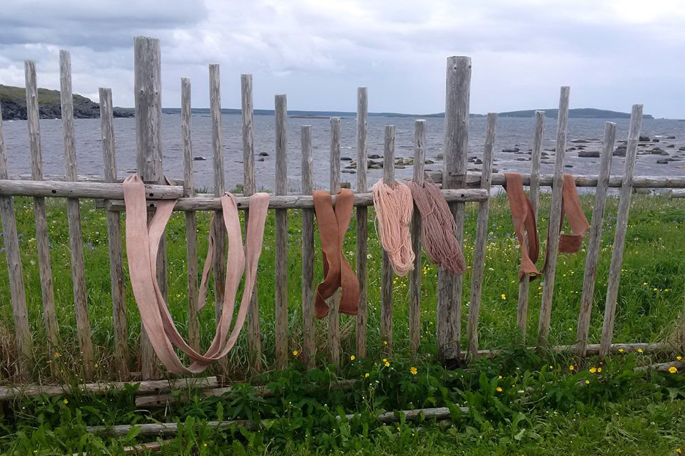 On Day 4, Parks Canada interpreter Bonnie Hynes brought in some commercially sourced madder to continue the dye pot. It was added to the already existing madder with additional water, to refresh the dye. As the dyeing process continued over the next few days, people brought more stuff to throw in. Diane wanted a sun hat dyed, Bonnie wanted more of her Briggs and Little yarn skeins added, and Jo wanted some linen thread added. Another pair of wicklebanders was dyed. Karen also overdyed two skeins of her own that started off yellow and turned out a kind of reddish orange.