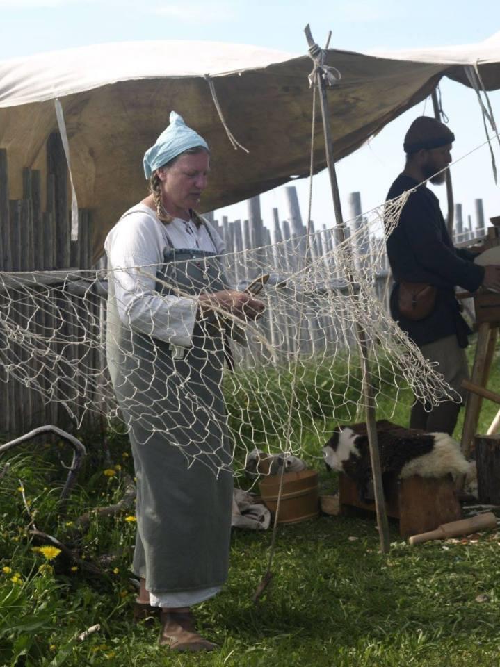 One interesting thing about working with traditional skills is that you will often meet visitors who have a history with that skill. On this visit, Diane not only got to teach one of the archaeology students about netting, but she also got to learn about it from a visitor. As a child, this visitor had worked with his grandfather on hemp netting by keeping his grandfather's netting needles full so that his grandfather never had to stop working. Similarly, one of the Parks Canada staff could share netting knots and some of the history of dip nets in the local area (See Figure 14).