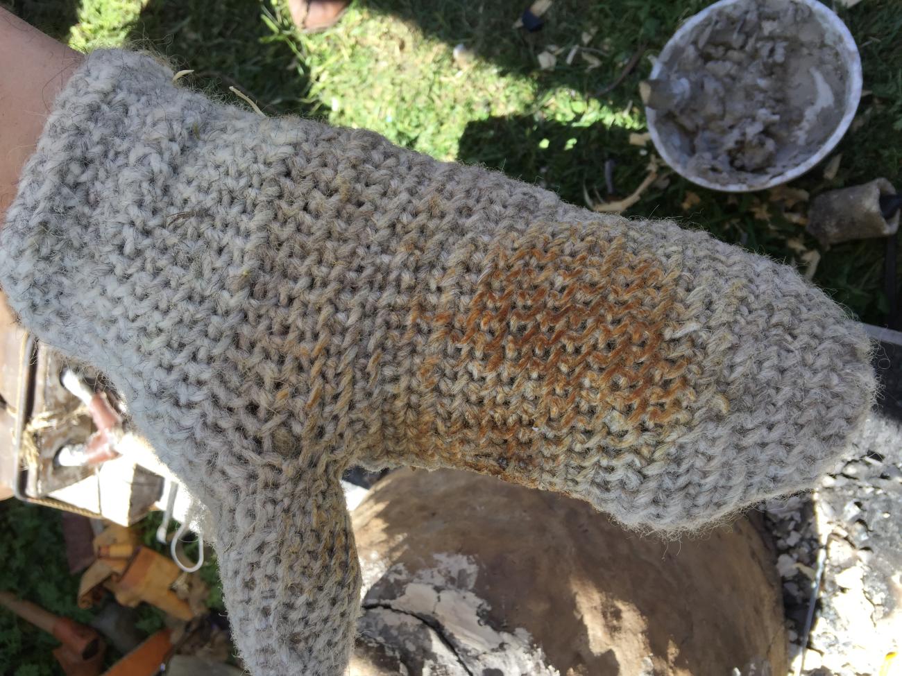 The first of these was the oven mitt. The bead furnace seen in Figure 8 has a white line near the top. The furnace above that line lifts off, allowing the furnace to be refilled with charcoal. The top is then replaced and sealed with a simple wet clay mix that is painted over the seal. For years, we have simply used a modern welders' glove for protection when lifting the (very hot) lid. One question that has always been outstanding was 'what would they have used'. On this trip we decided to test a theory we had. Karen used nålbinding to create a mitten like those found in sites such as Iceland, using Icelandic wool. It was originally thought that due to the high level of heat (the gases exiting the chimney can have temperatures in excess of 1200°C), a complex design such as two mittens with a leather insert might be required. The design tested over the course of several days involved only stuffing one side of the mitten with the remains from the wool being combed for spinning. This proved entirely acceptable for the periods of contact required. The mitten itself received only minor damage over those days. This will be followed up with some additional observations including temperature readings of the external face of the chimney and a time/temperature curve for inside the mitten. A count of usage and damage will also be recorded over time. These results will be published in the future (See Figure 17 and 18).