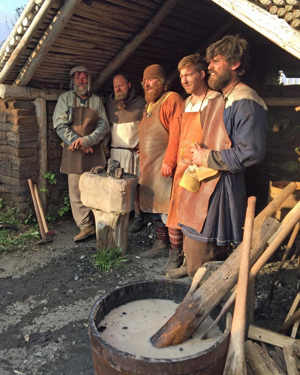 In 2010, DARC mounted the culmination of one of our iron smelting experimental archaeology sequences by successfully recreating the original smelt that was done on the site around 1002 AD1 . In 2017, the Parks Canada staff honed their skills by mounting a second smelt under the leadership of Parks Canada's Mark Pilgrim, with supervision from DARC's Darrell Markewitz and only minor help on the bellows by additional DARC staff. The 12-hour smelt was successful in converting 29 kilograms of bog ore analog (a.k.a. "DARC dirt") and 55 kilograms of charcoal into a 5.5-kilogram iron bloom. The bloom will be used by Mark to create various objects during this season's activities, including boat rivets to be used next year when Parks Canada plans to begin work on the reconstruction of a faering (a small fishing craft). The bloom was broken up and worked down further towards the 'bar' form on a later day. On the final weekend, a new smelter was constructed to allow the staff to do an additional smelt later in the season (See Figure 1, 2 and 3).