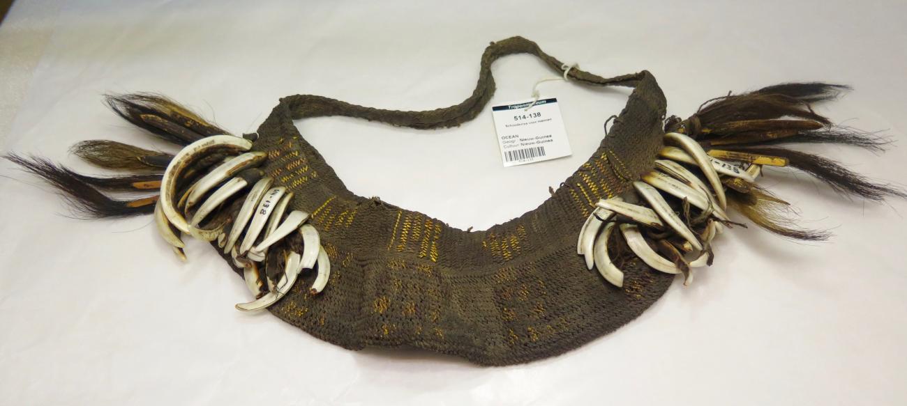 Aside from the types of baby carriers that became popular in the West in the second half of the 20th century, most carriers around the world are amply ornamented and hung with decorative objects that have a symbolic, often a prophylactic meaning. An example of the last are the tiger and leopard teeth pointing menacingly outwards on the baby carriers of the highest ranks in Timur, Indonesia, undoubtedly not just a decoration showing off wealth, but at the same time warding off evil forces (Van Hout, 1993, p.104). Sometimes specific objects are chosen and fastened in a way to produce sounds, like the decorated bone pendants fastened to the tsompirontsi sling of the Asháninka of Peru, the tubular beads ending in shells that dangle against each other in an African animal skin carrier from Cameroon, or the large snail shells touching each other in an example from Malaysia (Van Hout, 1993, pp.16, 44, 84, 101). The sounds produced do not only constitute a reassuring rustle, but also have the purpose of warning off spirits and evil forces (Van Hout, 1993, p.86). The sounds of the 32 wild boar teeth on the Skateholm pouch sling presumably did so, too.