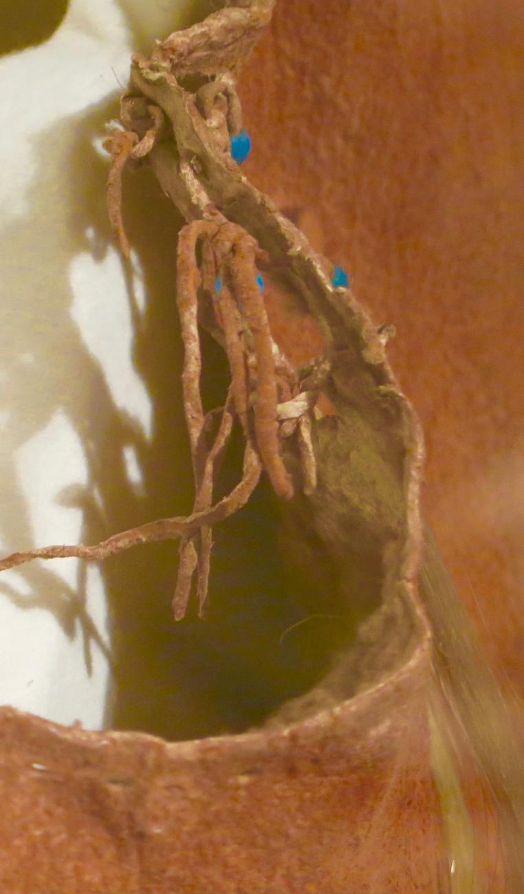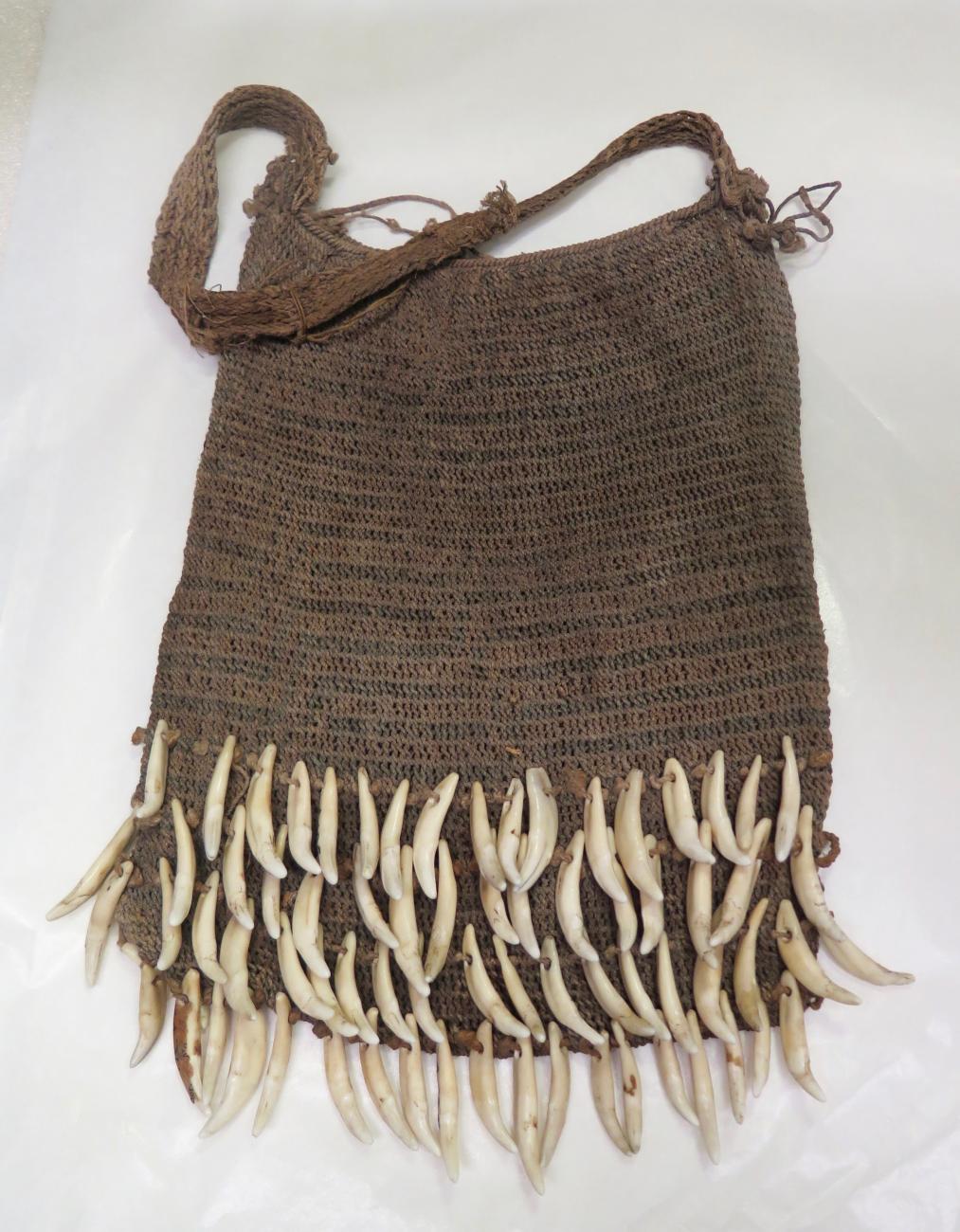 The Skateholm tooth pendants were attached to the sling with cordage of some sort that has decayed. We do not know what type of cord was used, of what material it was made and what kind of knots were used. No other archaeological examples of tied-on pendants exist that can serve as a guide. We were able to have a close look at two ethnographic examples from the collection of the Tropenmuseum, Amsterdam, that seemed to be related. Both were carrier bags with animal tooth pendants that, to judge from photographs, were attached in a way to allow them to move and rattle. A man's shoulder bag from one of the Papua-cultures in the Central Mountain Area in New Guinea is decorated with two clusters of pig teeth, similar to the wild boar teeth in Mesolithic Scandinavia (See Fig. 11). In both clusters two rows of teeth are overlapping, just as we planned for in the Skateholm reconstruction. When the object was scrutinized, it appeared that the teeth were not meant to be moving, primarily nor secondarily. On the contrary, in order to keep them in the desired alignment, they were fastened with stiff strips of bamboo to a stick hidden invisibly in the inside of the bag. Apparently, the visual aspect was the most important and the menacingly outward pointing teeth probably had a symbolic meaning. A second carrying bag from a Papua culture is decorated with rows of in total 72 dog tooth pendants that seem to be loosely attached, serving as a rattling ornament (See Fig. 12). A bag like this was a valued possession and was passed on by heritage, which illustrates the symbolic value the tooth decoration carried. These appeared to be fastened on the bag by lacing, not with loops that would allow them to move freely (See Fig. 13). Here too, the visual aspect of teeth pointing outwards apparently was important and dictated the way the teeth were tied. Nevertheless, the teeth will have touched one another occasionally, as can be concluded from teeth damaged by concussion, and then probably made a rattling sound. Further study of ethnological objects with pendants tied on with the primary goal of producing a rattling sound may suggest, how to tie pendants for the desired effect.