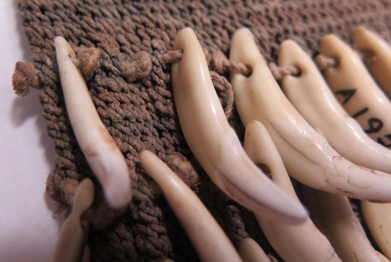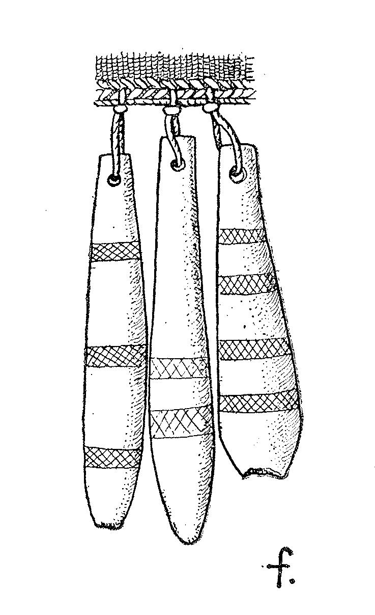 Other ethnographic examples we studied were rattles worn while dancing, in the shape of belts, aprons, mittens, and leggings from the Americas (BM, 2016; NMAI, 2017; NMNH, 2017). On the basis of the photographs, here the hooves, claws, beaks or teeth are tied with various types of wide loops that allow the pendants to move freely. In Karl Gustav Izikowitz’s book on musical instruments of South America, a number of so-called “jingle rattles” are depicted by line drawings, which show how the tying string is laced and knotted (1934, Figs. 13a‒f, 14a‒f). The jingles or pendants are all bell-like hollow shells tied to the edges of braided bands, but one example stands out as these pendants are made of decorated bone in a shape resembling teeth (See Fig. 14). These are tied to the lower rim of a cloth baby sling on loops that allow them to dangle (See Fig. 15). The geometric decorations of the bone pendants, as well as the rattling sound these produce, are believed to protect against evil and sorcery (Van Hout, 1993, p.86).