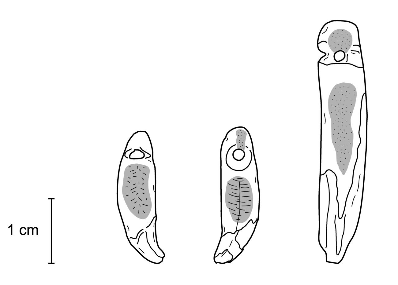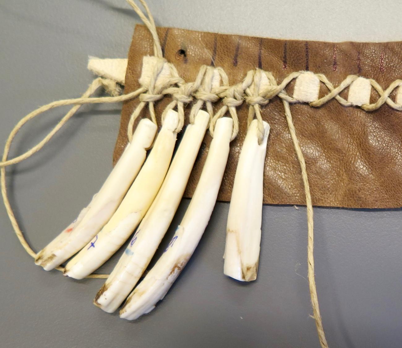 Strung rattles of teeth, hooves, claws, beaks, shells or other hard objects are found across the globe. These sound instruments, which are often suspended from different parts of the body or clothing, shake during the wearer’s movements and produce a rattling sound (Sachs, 1929, pp.8–9; Blades, 1970, pp.36–37). Portable percussion instruments like this call forth rhythmic movements and, almost automatically, a musical pulse. Among natives of Alaska, British Columbia and Hawaii, for example, rattling necklaces, belts, aprons, mittens, and leggings were used to highlight dancing (Krause, 1885, pp.140, 168, 202; Ho'oulu Cambra, 1984a; 1984b; BM, 2016; NMAI, 2017; NMNH, 2017). Traces of similar rattles can also be found in prehistoric archaeological contexts. Mesolithic and Sub-Neolithic graves in Northern Europe often contain perforated or grooved animal teeth, which appear to form rows or bunches on the head, chest, arms, hips, or legs of the deceased (Stenberger, 1943; Gurina, 1956; Jaanits, 1957; Janzon, 1974; Zagorska and Lõugas, 2000; Burenhult, 2002; Zagorskis, 2004; Larsson, 2006). Although vegetable fibres and leather components are missing from these graves, it seems obvious that the tooth pendants were strung like beads or suspended from the accessories or clothing. Sometimes the remains of shells, hooves, or beaks can be found in the same sets (Petersen, 1990, pp.32–33; 2015, pp.93, 147–149). Use-wear analyses of approximately 150 tooth pendants from Ajvide, Sweden (3200–2300 BC), and Yuzhniy Oleniy Ostrov, Russia (7000–6200 BC), provide concrete evidence in support of the rattle hypothesis. Polish around the perforations suggests that the pendants hung more or less freely in their suspension loops, while pitting in the lower parts suggests that the pendants bounced back and forth and struck one another (Rainio & Mannermaa, 2014; Rainio, et al., 2015). As evidenced by experiments with fresh animal teeth, collisions of this type between adjacent pendants must have generated a rattling sound.