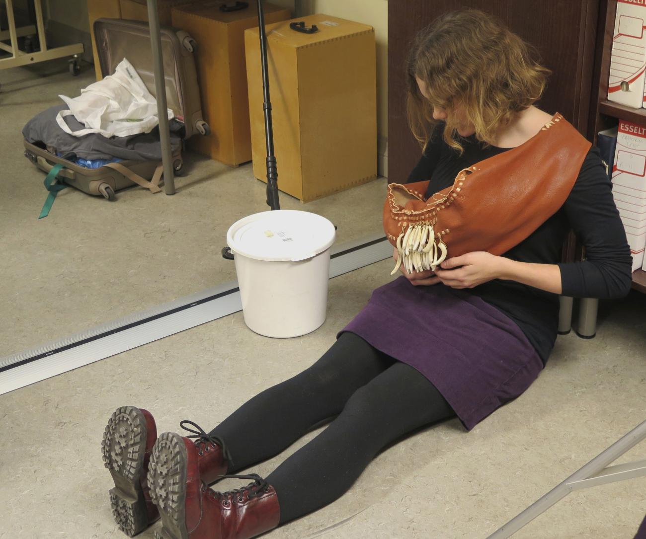 As the abraded, pitted areas on the traceologically studied Ajvide tooth pendants were on the sides only (See Fig. 16), we were searching for a way of tying that on the one hand allowed the teeth to move freely, but on the other hand made them touch one another on the sides only, and then made them fall back in the original position. The depictions of the “jingle rattles”-cordage in Izikowitz’s book (1934, Figs. 13a‒f, 14a‒f) are very detailed, enabling us to replicate them with cord. This we did, trying out traditional sailor’s knots as well. A large number of ceramic imitation teeth were fashioned in the shape of wild boar teeth and provided with a hole at one end. These were fastened using different cordage and different ways of tying onto leather patches that in turn were pinned to an apron of coarse linen. The apron was worn for several days while doing housework, in order to observe how the imitation teeth moved and how they sounded. It turned out that with many of the methods of knotting the teeth tangled easily because of their curved shape. The best result was gained with a plaited loop, known as the “angler’s knot” or “perfect loop”, when tied to the decorative and enforcing lacing (See Fig. 17). Different cordage materials were also tried. Animal materials like thin thongs, gut spliced lengthwise, or sinew fibres from hoofed animal’s legs, proved not pliable enough to allow the teeth to move freely. Vegetable cord material, however, worked well. The thickness of the cord used originally is unknown, but was limited by the holes drilled in the teeth. In Mesolithic Scandinavia, cord would have been made from locally available materials, like inner bark fibres from trees and nettles (Hurcombe, 2014, pp.30–36, 48). For the Skateholm exhibit reconstruction, we used a more easily available material, flax bast cord. The knotted loops, as well as the cord used, worked as desired: the teeth dangle alongside one another without tangling, producing a rattling sound.