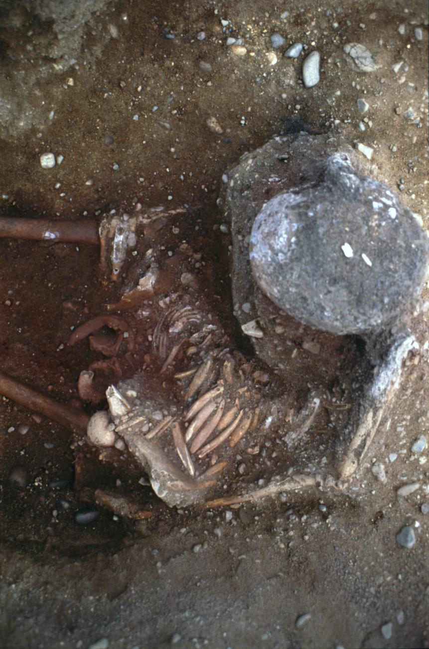 Possibly the oldest sources, and at the same time rare examples, for the existence of baby slings in the Western world are two frescoes depicting the Flight into Egypt of Giotto di Bondone (circa 1267–1337), one in the Capella dei Scrovegni, Padua (1304–1306) (Van Hout, 1993, p.7), the other in the Lower Church of the San Francesco, Assisi (1315–1320). In both, Mary is riding a donkey, her arms bent around the infant Jesus who is secured to her chest by a sling. This is a simple cloth band fastened with a knot that is visible just below Mary’s shoulder. A baby sling is but one of several different types of baby carriers. Inflexible carriers as the cradle-like devices or basketry backpacks are carried on the back, those of pliable materials, cloth, plaited cord or leather, can be shaped for carrying on the chest or on the back. Native American mothers of the Central Plains used small wooden cradles as well as soft pouch-like carriers. In museum collections the decorated hoods of these little known soft carriers are kept, some of these carrying rattling fringes (Greene, 1992, p.97). The choice of material is in large part determined by the climate the sling is used in. In tropical climates a loosely plaited sling from vegetable cord seems most comfortable for a baby, but in Africa thin leather carriers are used as well. The way the arms of the mother in Skateholm grave 6 are bent around the baby, suggests it was enfolded in a pliable carrier. Considering the climate, this carrier was probably made of leather. The presence of red ochre speaks for leather too, as described below. The position of the tooth pendants mostly on top of the baby suggest that this carrier was a sling in the shape of a pouch, the teeth being attached to the upper rim.