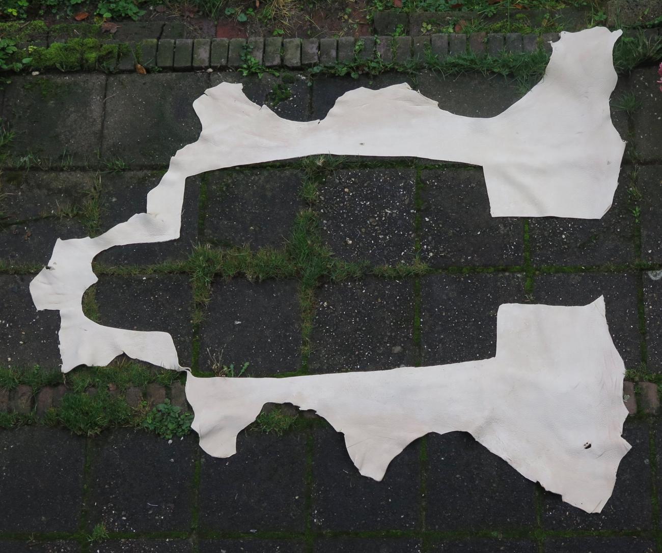 The ochre probably was used for its decorative value too, a deduction that can be made safely when the ochre is applied to one side of the hide only. An ethnological example is a Native American ceremonial bison robe of 1830 in the Ethnological Museum, Berlin, that probably was smoke-tanned and afterwards painted with ochre on the outside (See Fig. 4 and 5). This was probably done on purpose on one side only to prevent the ochre of rubbing off on the person wearing the robe. We assume that for the same reason the red ochre on the Skateholm sling was applied on one side only. As the actual reconstruction was meant to be an exhibit travelling for a few years, it should require no maintenance like being rubbed with ochre fat every few days. Hence a tanned red deer (Cervus elaphus) skin was chosen as material for the sling (vegetable tanned), to be coated with red ochre paint. The use of butterfat and other animal body fats or vegetable oils as a medium for the paint being not practical in an exhibition setting, the red ochre powder was mixed with egg yolk. This is a natural oil-in-water-emulsion, consisting of about 51% water, 15% albumin, 22% oil, 9% lecithin, 1% minerals and 1,5% other substances. The lecithin is the emulsifying agent, active too when the yolk is mixed with other ingredients. After vaporization of the water, the oil hardens by polymerization, enclosing the ochre particles with a protective film (Borradaile and Borradaile, 1982, p.156). The yolks of ten chicken eggs in total were used for the whole hide, but it appeared eight probably would have been sufficient. In prehistory, when hens were not yet introduced, sea bird or duck, goose and swan species eggs, collected in spring, could have been used. The yolks of the chicken eggs were lightly rubbed by rolling between the hands in order to remove adhering egg white and punctured to let pour out the liquid yolk, as the membrane will not dissolve. Water was added and some acid juice to make the emulsion easier to paint with, as well as some drops of clove oil, a very effective method of preservative that was unknown in prehistory, but added in view of the exhibition.
