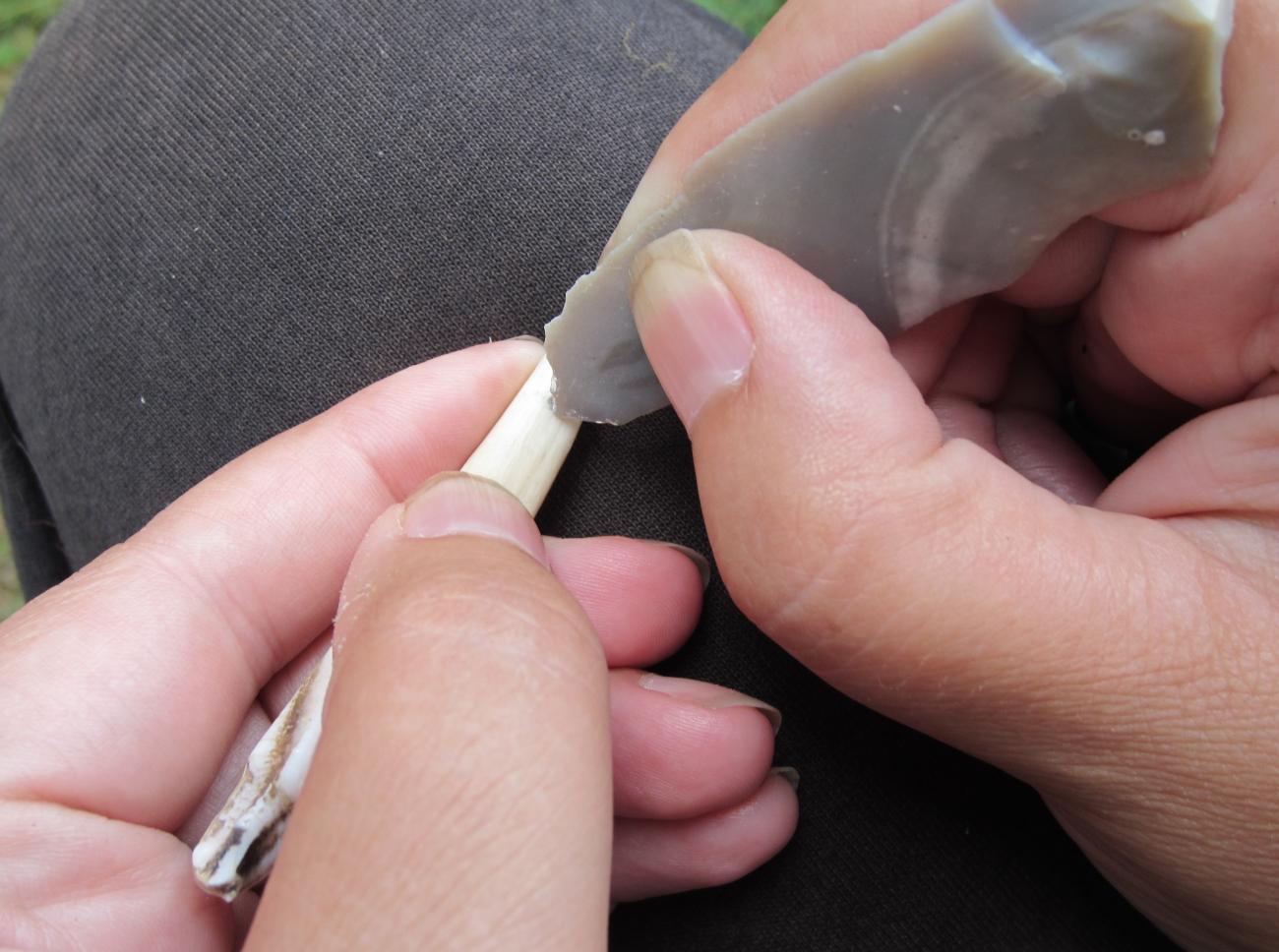 For the reconstruction, we ordered lower jaws of seven animals from the wild boar farm Koivikkonotko (http://www.koivikkonotko.fi/) in Eastern Finland, receiving five female jaws and two male jaws. To extract the teeth, we soaked the fresh jaws in a water bucket for 4–5 weeks. After gums and periodontal tissues had decomposed, incisors and canines could be pulled out easily (See Fig. 8). Molars with forked roots, however, remained stuck in their place. To perforate the teeth, we used both flint blades and modern needle-point files. The latter were used to spare the worker’s hands as they appeared to produce right type of perforations, around 2 mm in diameter. The point of the tool was rotated on two opposite sides of the root until it reached the root canal (See Fig. 9). This took 10–30 minutes. Young animals’ teeth with wide root canals were clearly easier to work with. Finally, to follow the example of the wild boar tooth pendants from Ajvide, studied earlier traceologically (Rainio & Mannermaa, 2014), the root tips of the incisors I1 and I2 were sawn off with flint blades and modern files. These 3 to 5-mm-long sections form unnecessary projections, as they are too narrow to receive a perforation. Their crooked form might also hinder the movements of the pendants, when the pendants hang side by side in a row.