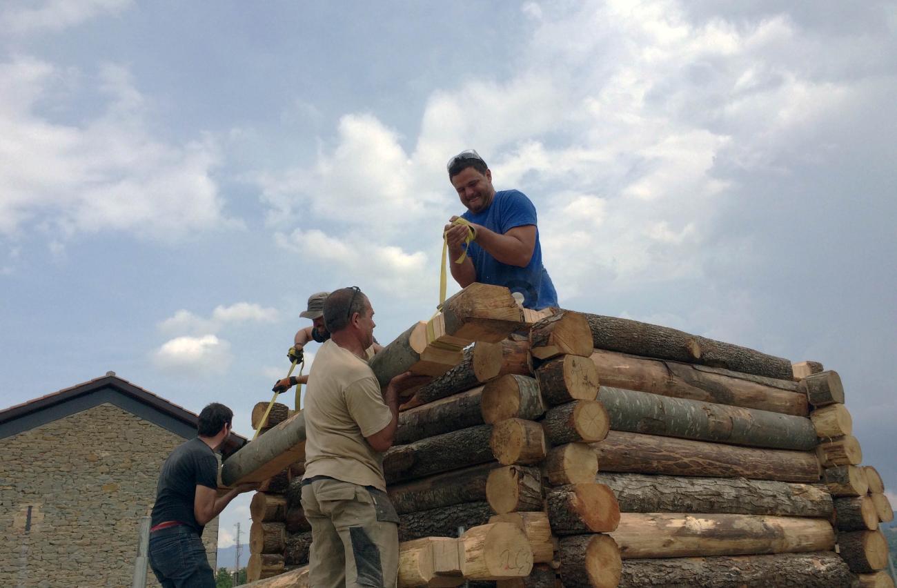 For the construction of the tower we used only the wood species identified from the archaeobotanic analysis of l’Esquerda site samples of carbonized seeds and woods from excavation. These species were: Maple (Acer campestre), Chestnut tree (Castania sativa), Cherry tree (Prunus avium), Beech (Fagus sylvatica), Ash (Fraxinus excelsior), Oak (Quercus sp.), Poplar (Populus tremula), Alder tree (Alnus glutionsa) and Black poplar (Populous nigra). The trees used in the experimental tower construction had been cut from an ecological forest by a specialised company who then delivered the wood. We used fresh wood, like Carolingian army probably did when they arrive in a place and must construct watchtowers very quickly. The trunks were all cut at the same lenght, 9 Carolingian feet, easier to carry away and to build.