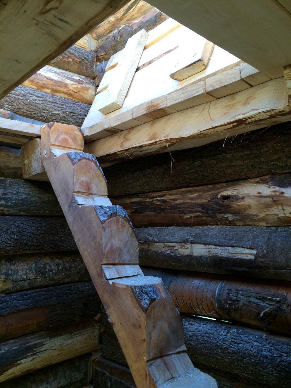 As progress was made, our plans were adapted: the inner ladder, thought to be constructed with two vertical trunks and several horizontal steps, was replaced by a simple model. A single trunk was placed diagonally with the steps cut in it. This decreased the construction time and also use of materials.