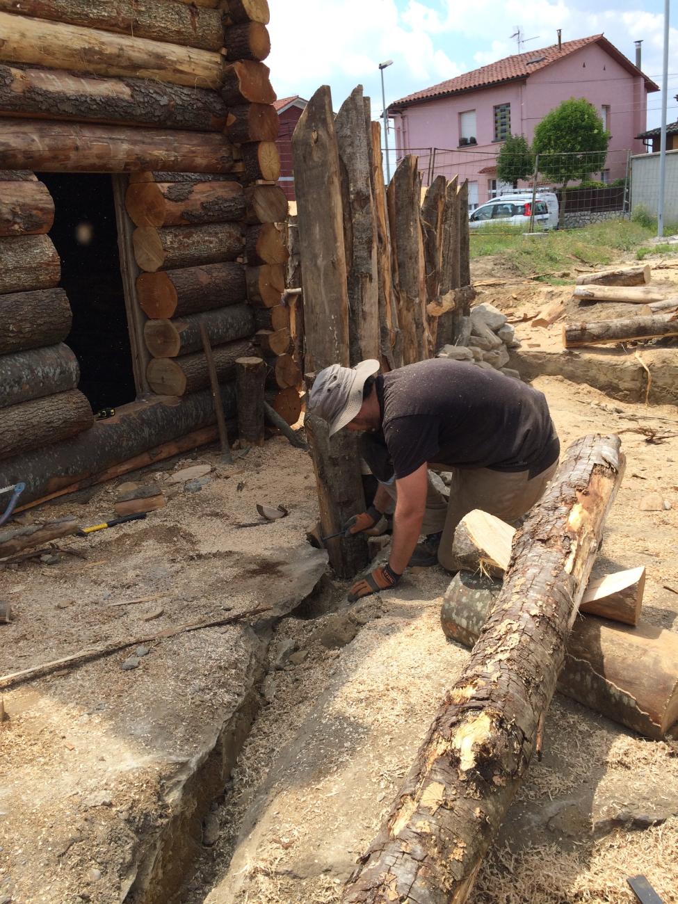 The outer palisade was raised using the rock diaclases, similar to the real sites. We fitted the trunks into the diaclase, holding one trunk with the other by cutting a transversal inner rail to mount the structure that the drilled postholes supports. This palisade was reinforced with stone blocks and earth from the outer side.