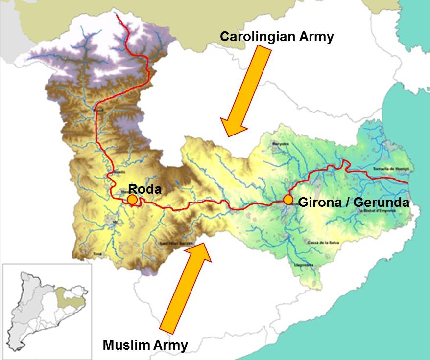 After the Carolingian conquest of Barcelona in AD 801, the frontier of the Marca Hispanica was established in the River Llobregat; however, there was an earlier frontier established during the late 8th century along the River Ter. This early frontier crossed the Plane of Vic and it defended the city of Girona, given to the franks in AD 785, and had an important role in the conquest of Barcelona. During this early frontier, the place of Roda Civitas, as Carolingian documents refer to it, appears to be a central place. Recent discoveries at the site of l’Esquerda, especially the 150 m long wall, date to the Visigoth period and re-occupation by the Carolingian army, demonstrating that this site was in fact the Roda Civitas named by high-medieval documents. To control the border, Carolingians occupied and rebuilt the ancient fortress of l’Esquerda, and archaeological evidence in the form of post holes and rock cuts indicates the presence of wooden watchtowers, in some hill tops along the River Ter.