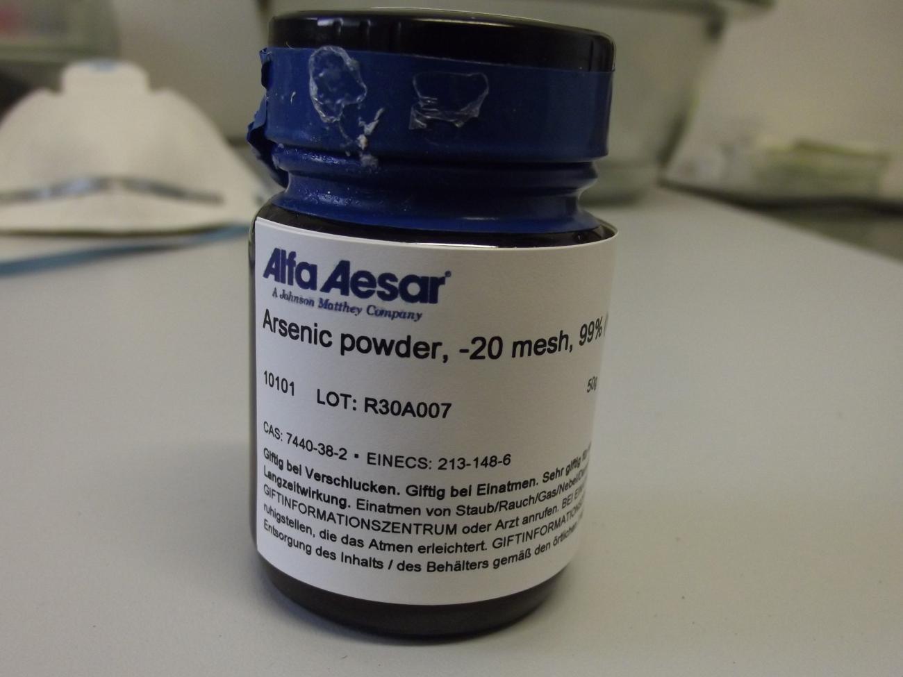 The fine copper was cut in squares of ca. 4 x 4 mm (0.16â) and the grey arsenic (in small particle size, Fig. 13) was charged into the crucible nearly at the bottom, on a shallow bed of copper plates and then covered with the rest of the copper and other elements. A steel casting tong was bend slightly to create a better grip on the small graphite crucibles.