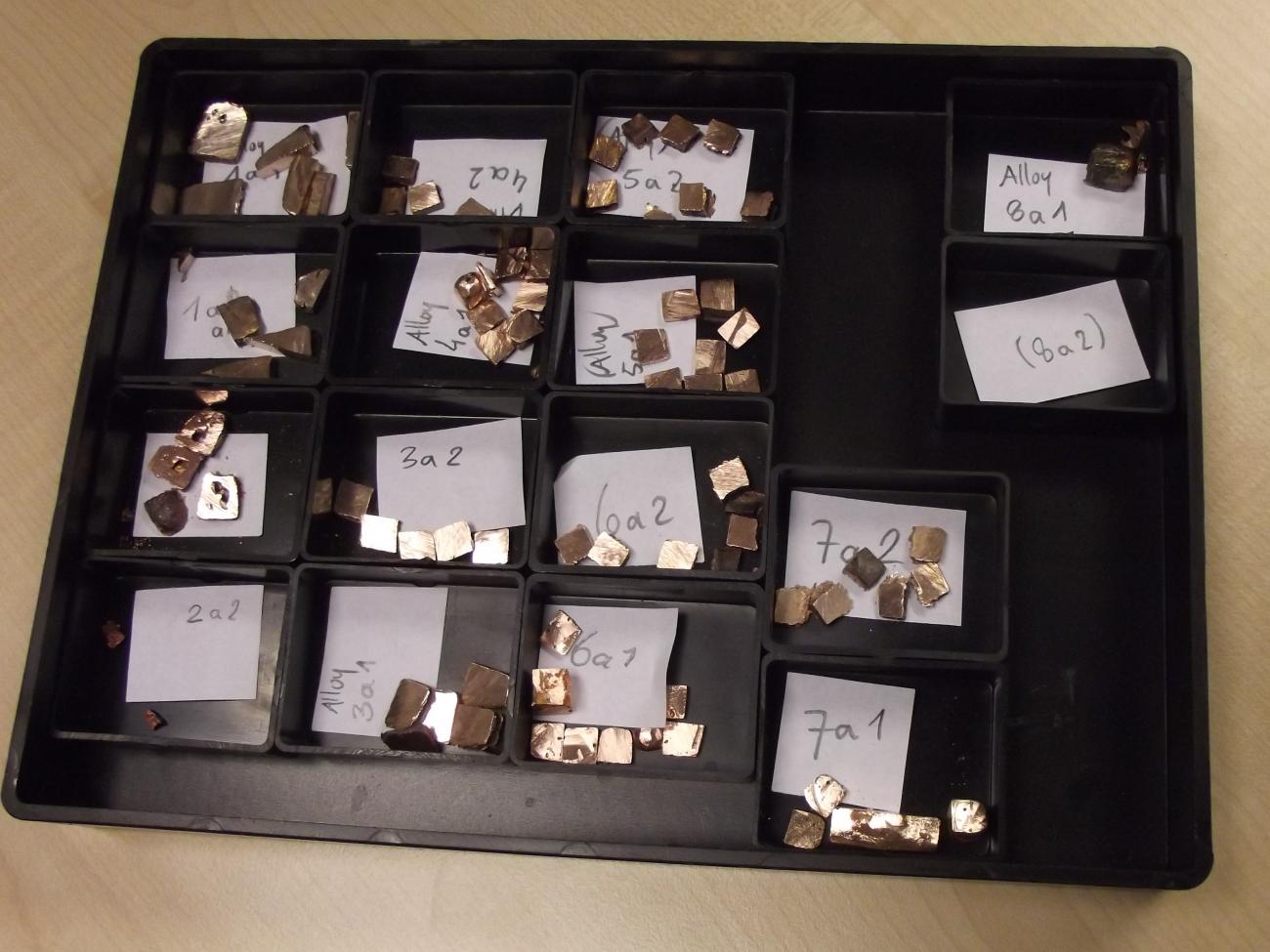 The samples proved rather hard to cut, as if they had a high density. Perhaps also due to the size of the ingots, but comparatively the samples that were only cast were almost as tough as compared to those that had been forged, regardless of the variation in annealing. Some of the alloys had a relative good ductility (alloy 1, alloy 5, alloy 8) while the others were less workable. One also turned out to be hollow inside (alloy 2), so the ductility of this alloy could not be adequately tested. Alloy 5 is the arsenic free copy which had a relatively good ductility, conforming to the description by Giumlia-Mair and Lehr (2003, p.297).